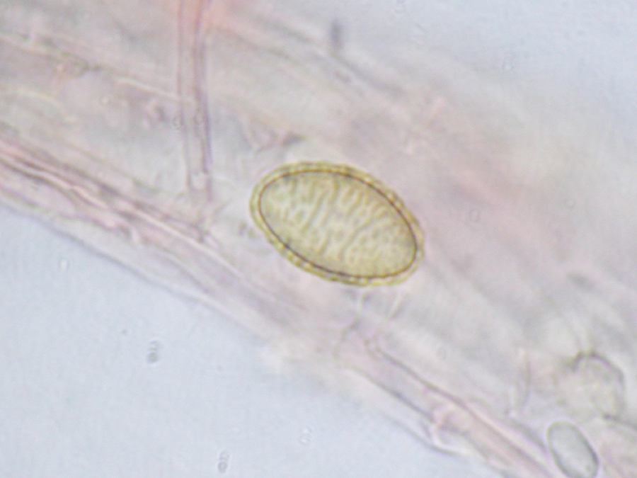 Insgesamt habe ich 5 Sporen gesehen. Diese elliptisch, gelb, mit einem Ornament aus horizontal verlaufenden Streifen.