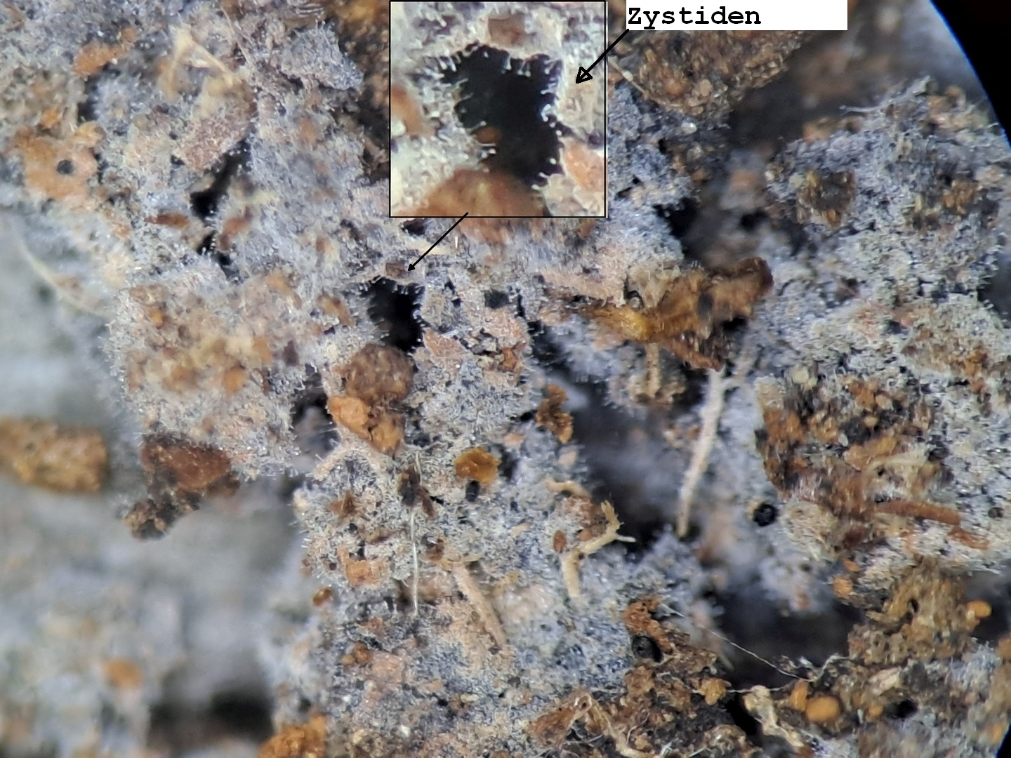 Unter der Lupe erkennt man die flaumigen, kleinen, reflektierenden Zystiden mit Köpfchen > siehe Lupenfoto