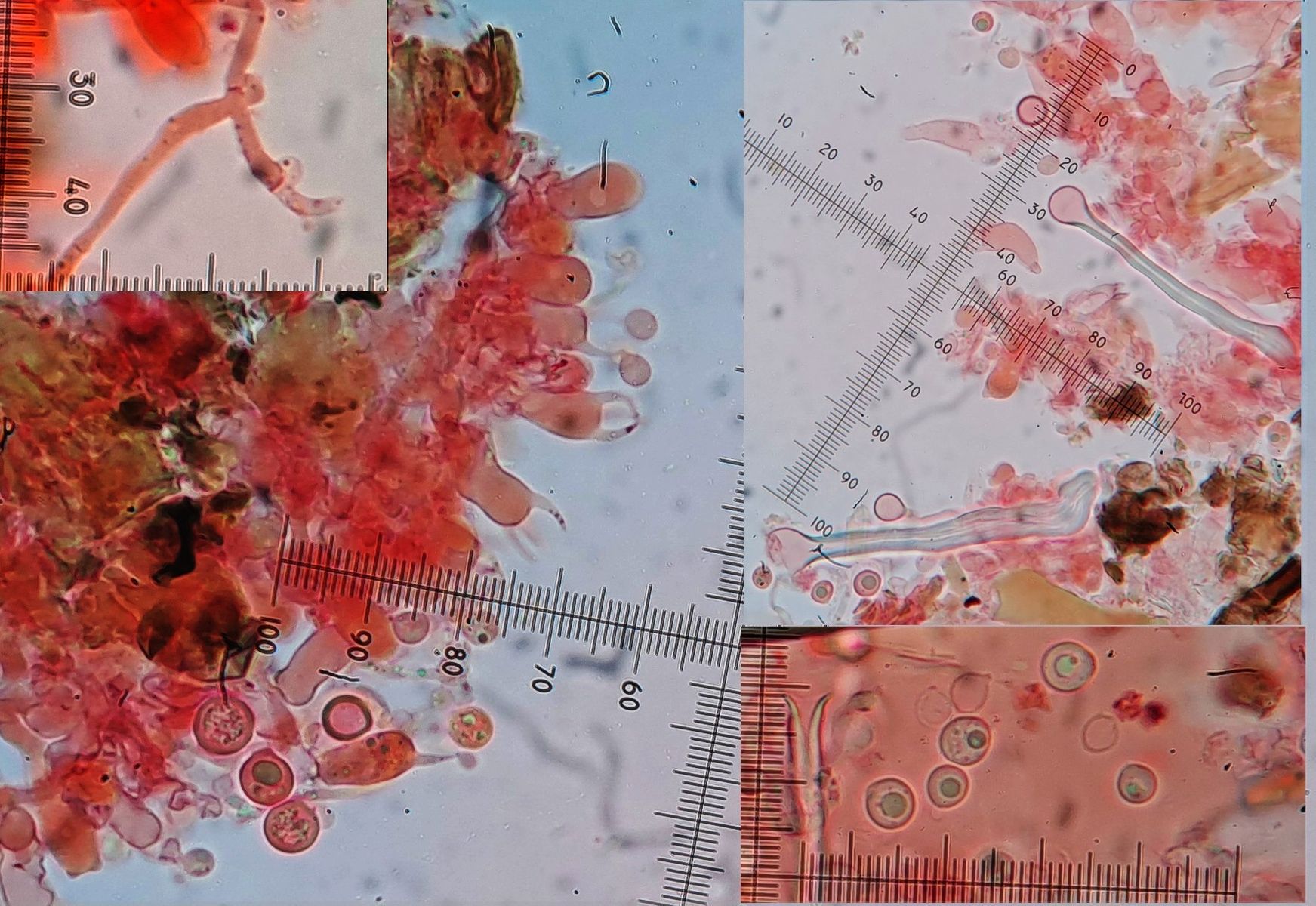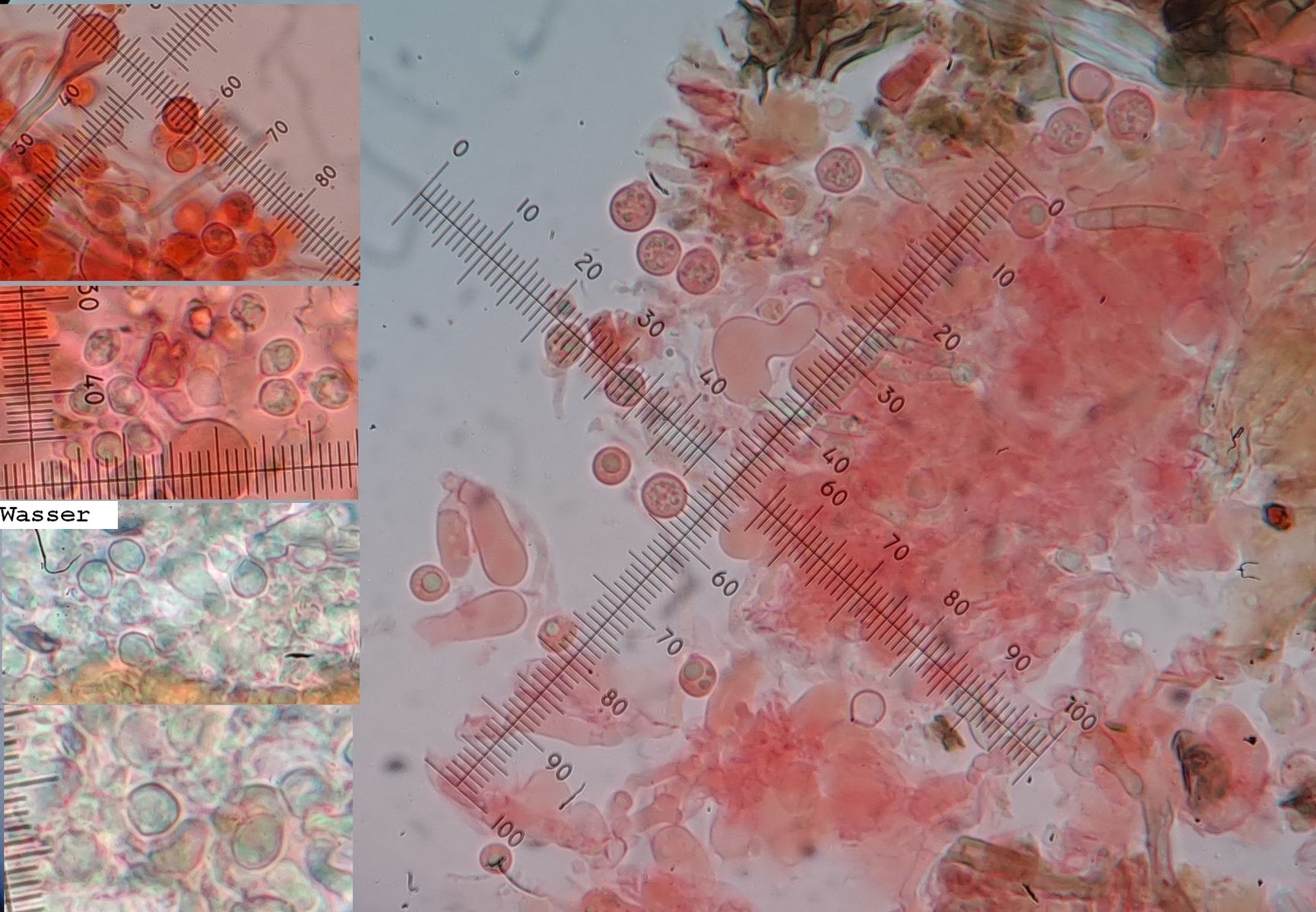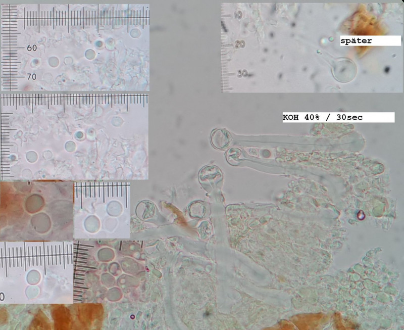 Sporen: rund-rundlich 4-5,5 (6) µm 1*, Q ca. 1,02-1,3 / kleiner Apikulus / Basidien: kurz-keulig ca. 10x4µm, Hyphen 1-2µm mit Schnallen.