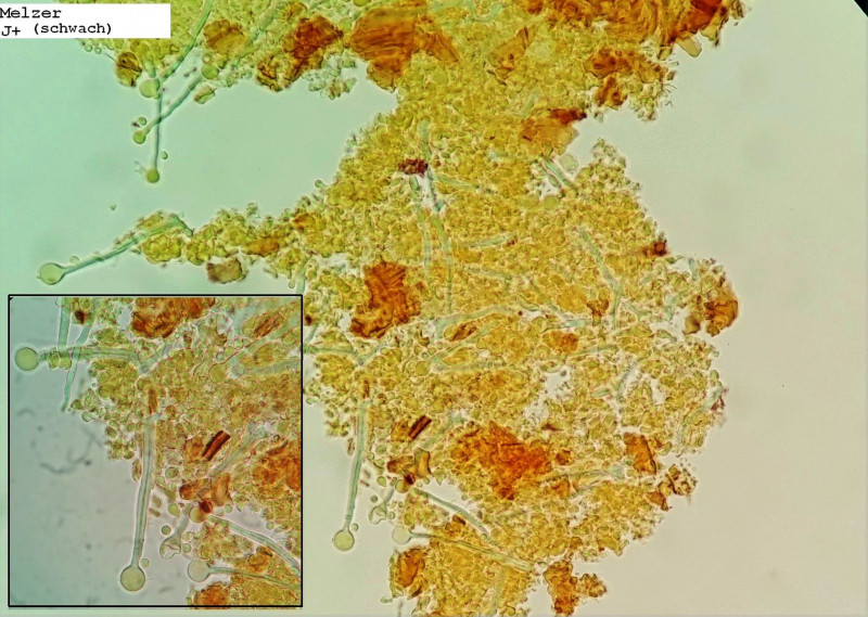 Die Zystiden sind in Melzer J+, schwach bläulich, wenn auch nicht so stark und auch verzögert. Zystidenkopf keine Reaktion > Foto