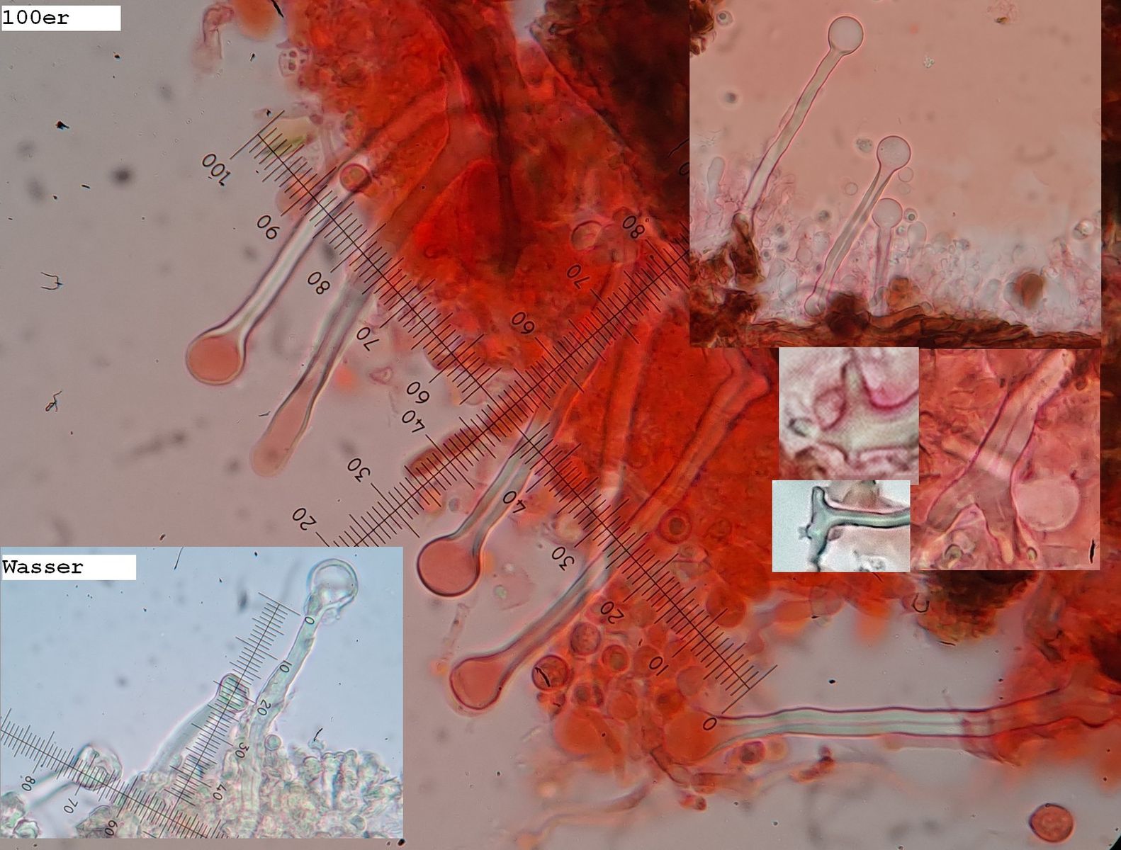 Zystiden: 60-85µm x 4-5µm, röhrig, apikal kopfig rund 7-9µm, dickwandig bis zum Kopfteil, dann nur noch schwach dickwandig.