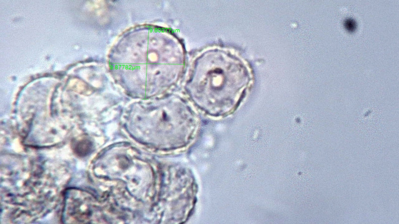 Ich denke eher das es vielleicht eine Lycogala ist. Dafür spricht eventuell die fädigen Strukturen welche möglicherweise das Capillitium sein könnten. Die Sporen sind für Lycogala eigentlich etwas zu groß, aber bei unreifen Fruchtkörpern hat man oft falsche Sporengrößen.