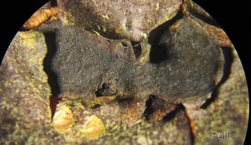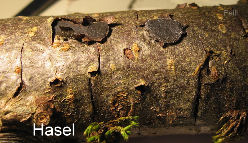 Ich hab mir nun einen im Strauch stehenden, abgestorbenen, trockenen, morschen Haselast mit ca 3 cm Durchmesser angeschaut, auf dem eine Biscognauxia wuchs.