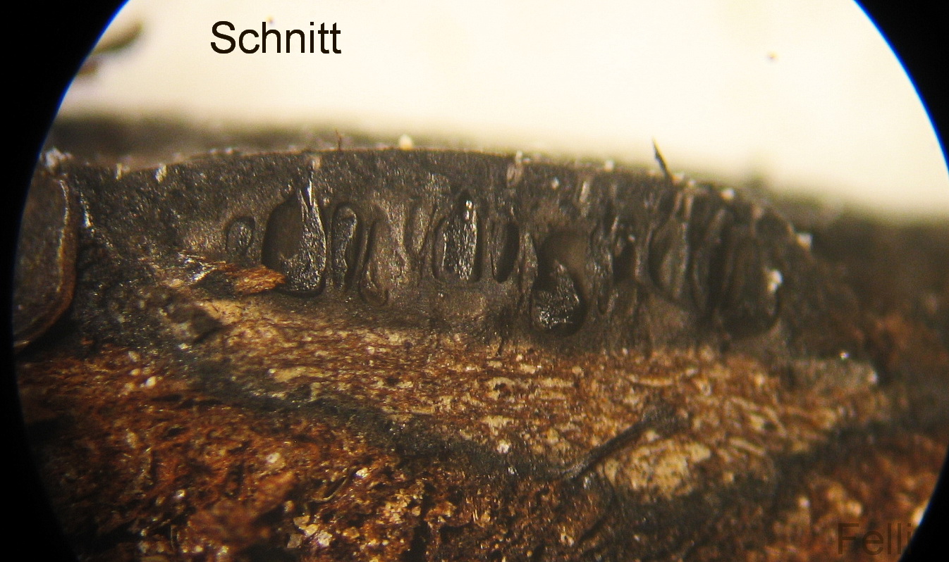 Im Schnitt sind die Perithecien +/- auf einer Linie angeordnet,