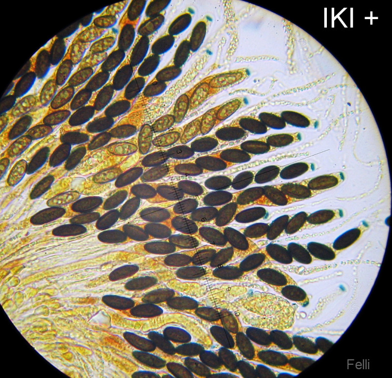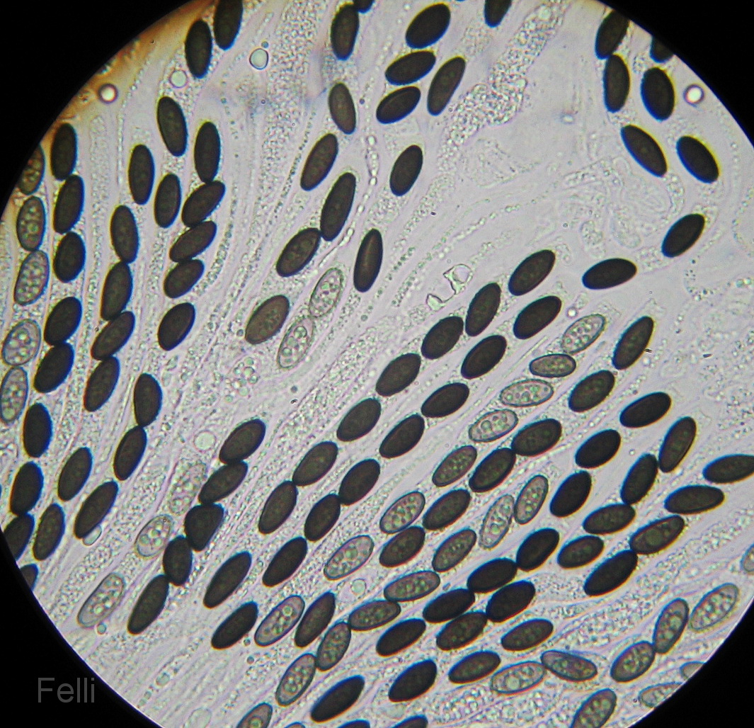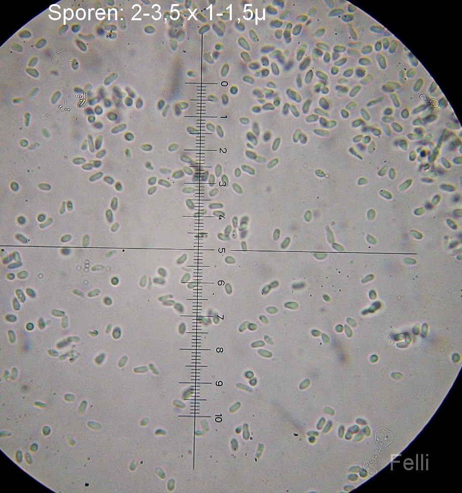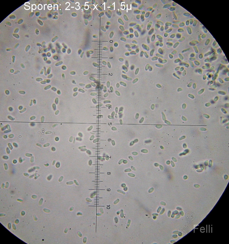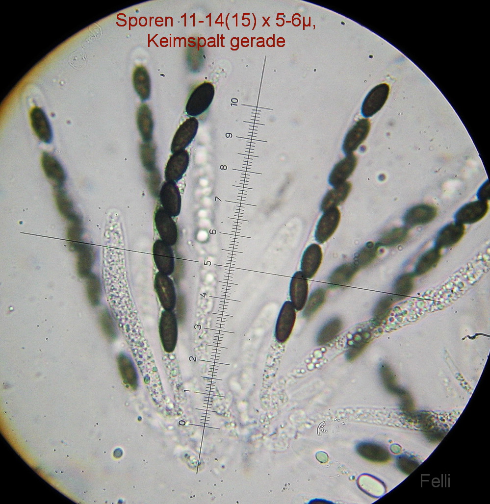 Die Sporen: 11-14(15) x5-6µ, sind braun, länglich-ellipsoid, mit einseitiger und gerader Keimspalte