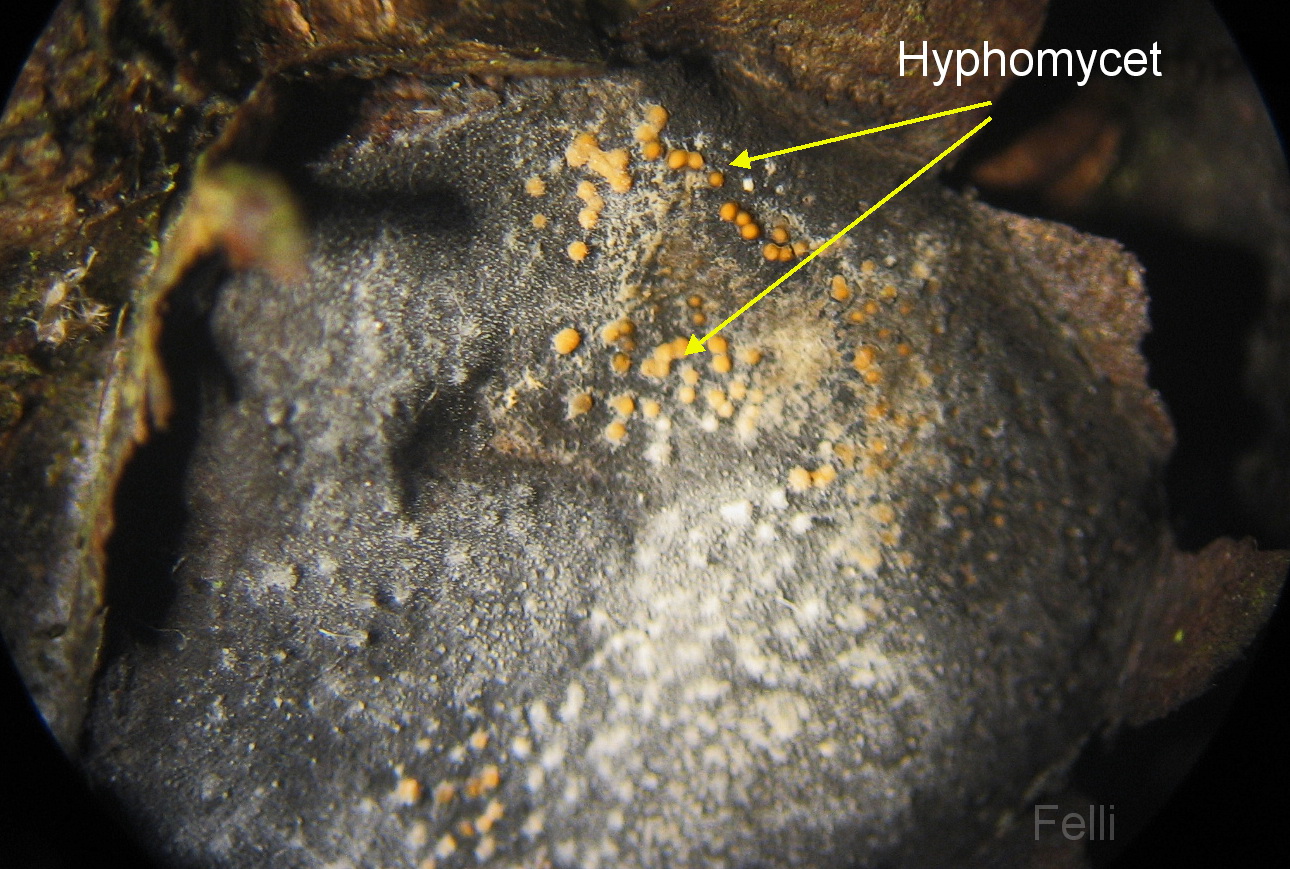 Auf einzelnen Stromata sah man einen weissen Hyphenfilz mit rundlichen, gelb-orange gefärbten,