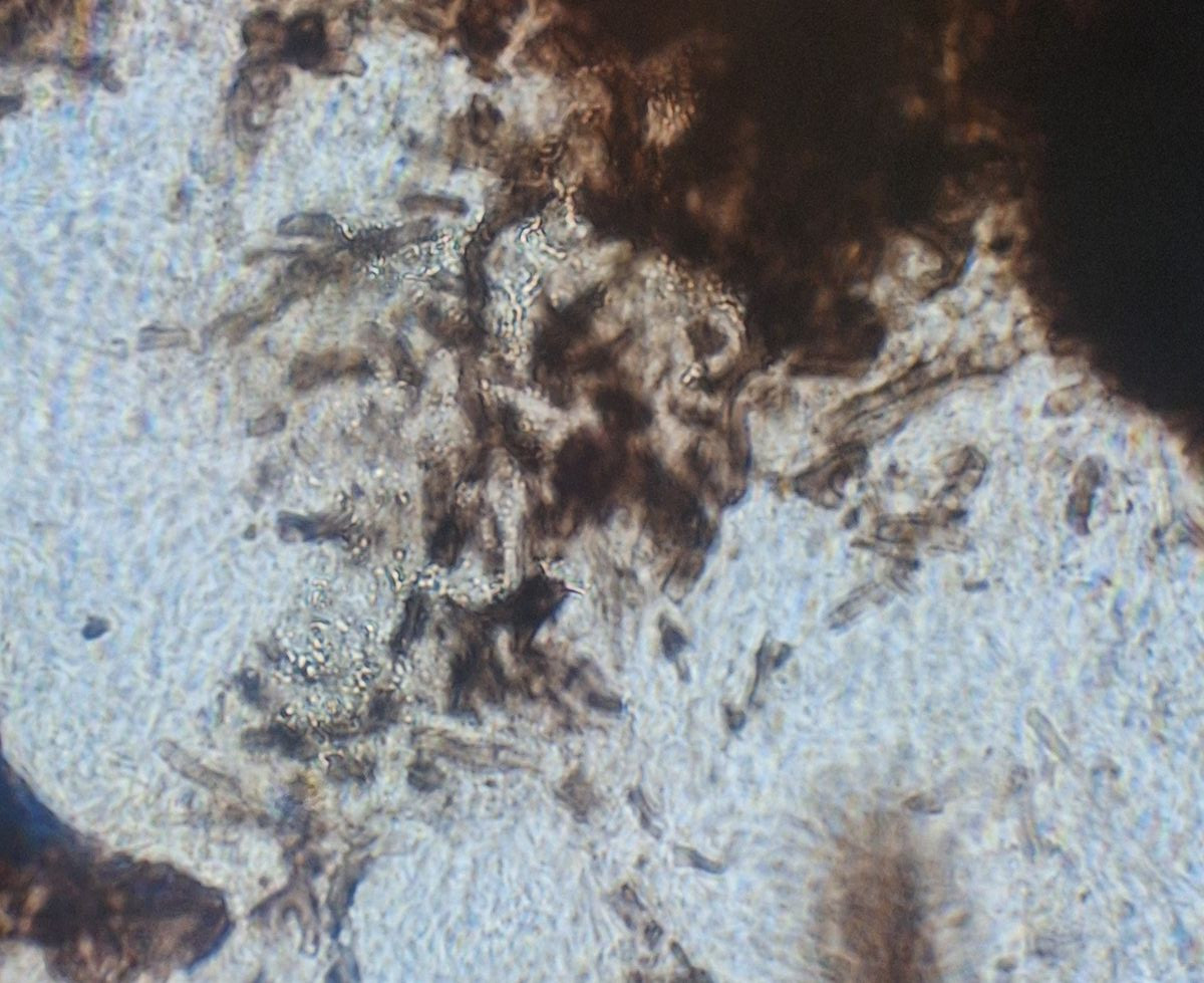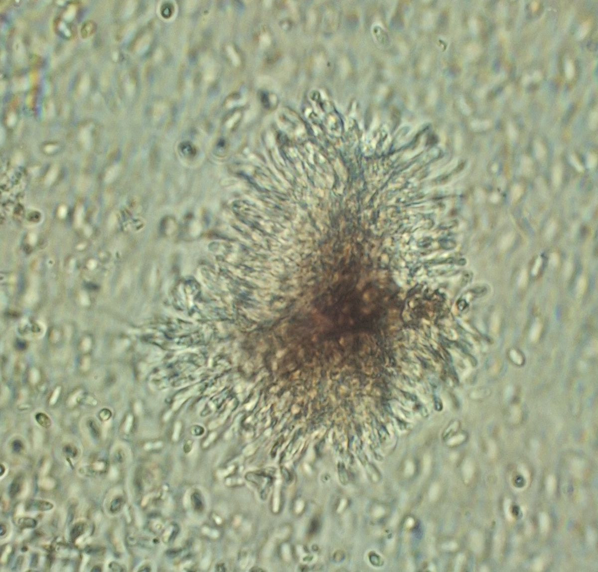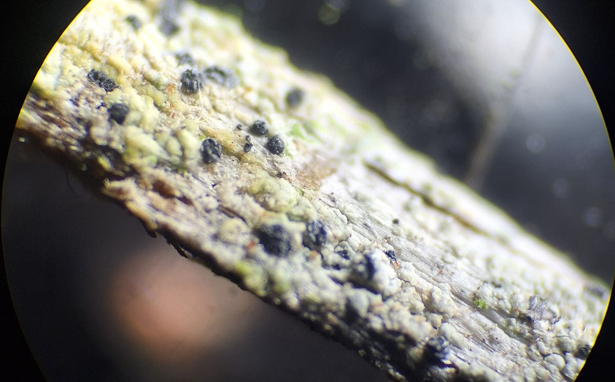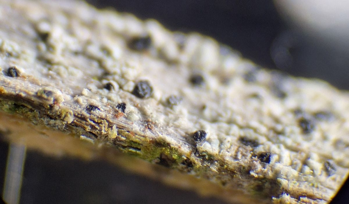 Nach dem Fund der immernoch unidentifizierten ungestielten Stecknadelflechte (Acolium / Cyphelium / Thelomma oder so) habe ich Ausschau gehalten nach weiteren Funden. Insbesondere weil Prof. Wirth, den ich dazu angeschrieben hatte, meinte, dass man auch (Pseudo-)Thelomma ocellatum nicht ausschließen könne, da diese Art neben der sorediösen Form auch im Verhältnis von 100:1 in einer Form mit Apothecien auftritt. Ich solle doch mal die Sporen vergleichen, ob das passt. - Abgesehen davon, dass meine Sporen nicht groß genug sind, auch nach weiteren Proben nicht länger als 19 µm, sollten dann doch auch zahlreicher die sorediösen Formen zu finden sein. Wobei mir nicht klar ist, wie die mikroskopisch aussehen sollen - Mikrobilder, sofern gefunden, zeigen immer die Apothecienform.