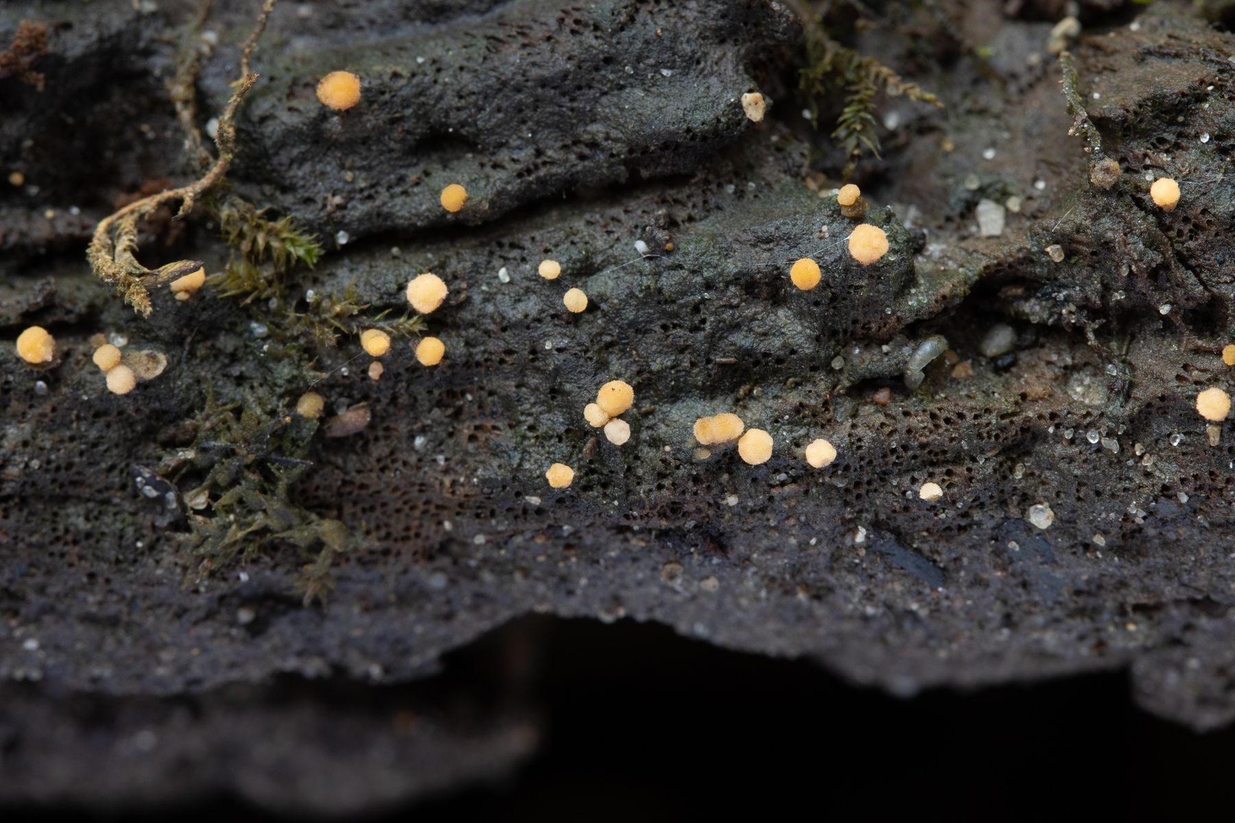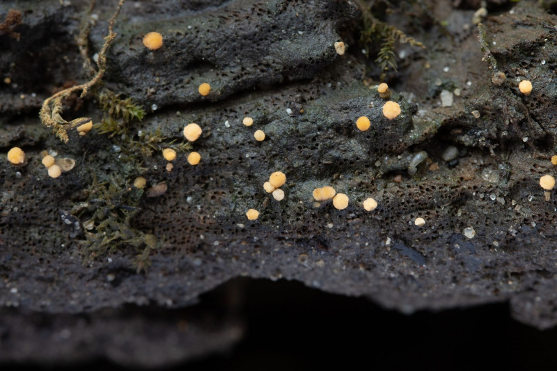 Bactridium flavum bildet gold-gelbe bis schneeweise kleine "Polster" aus.