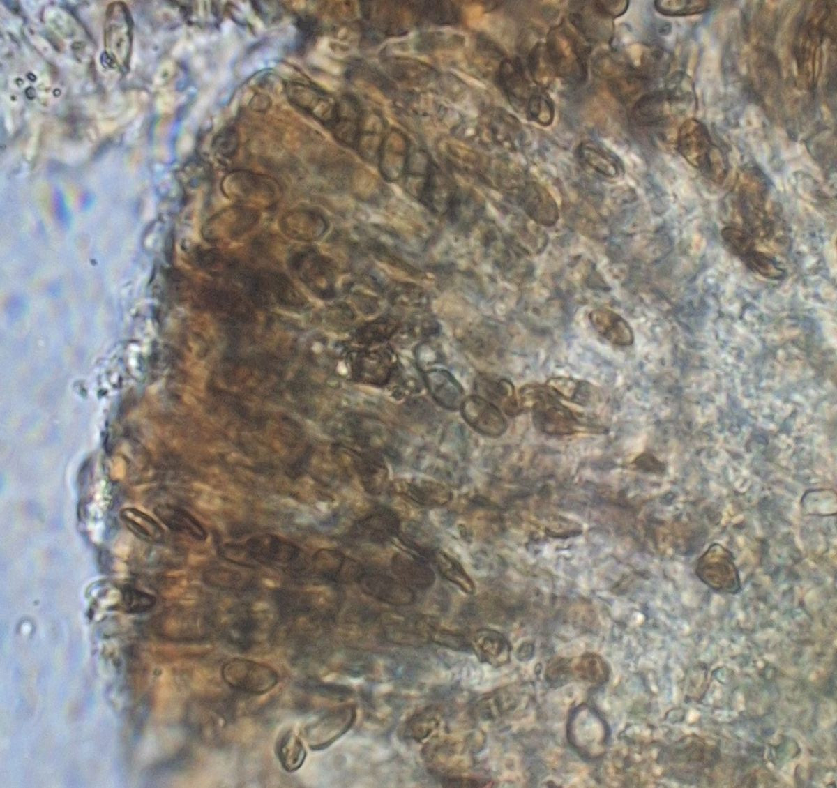 Asci 30-40 µm lang, einreihig, mitunter aber schräg liegend. Sporen schon im Ascus septiert.