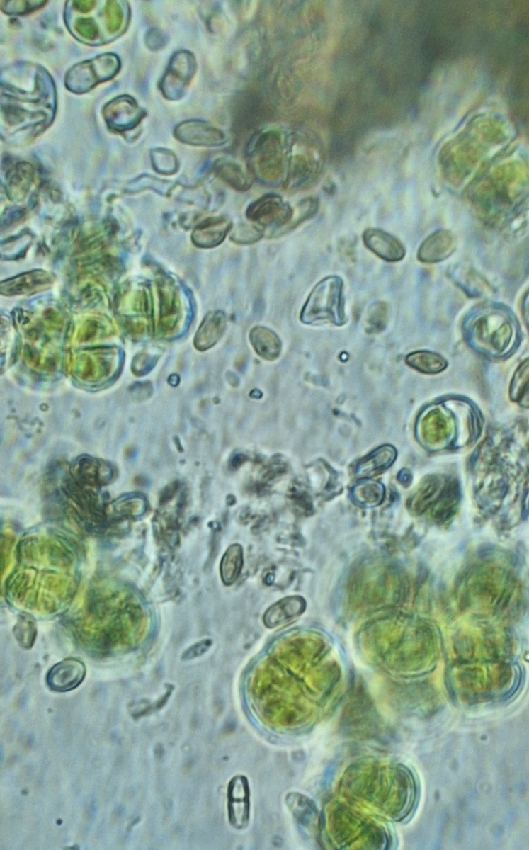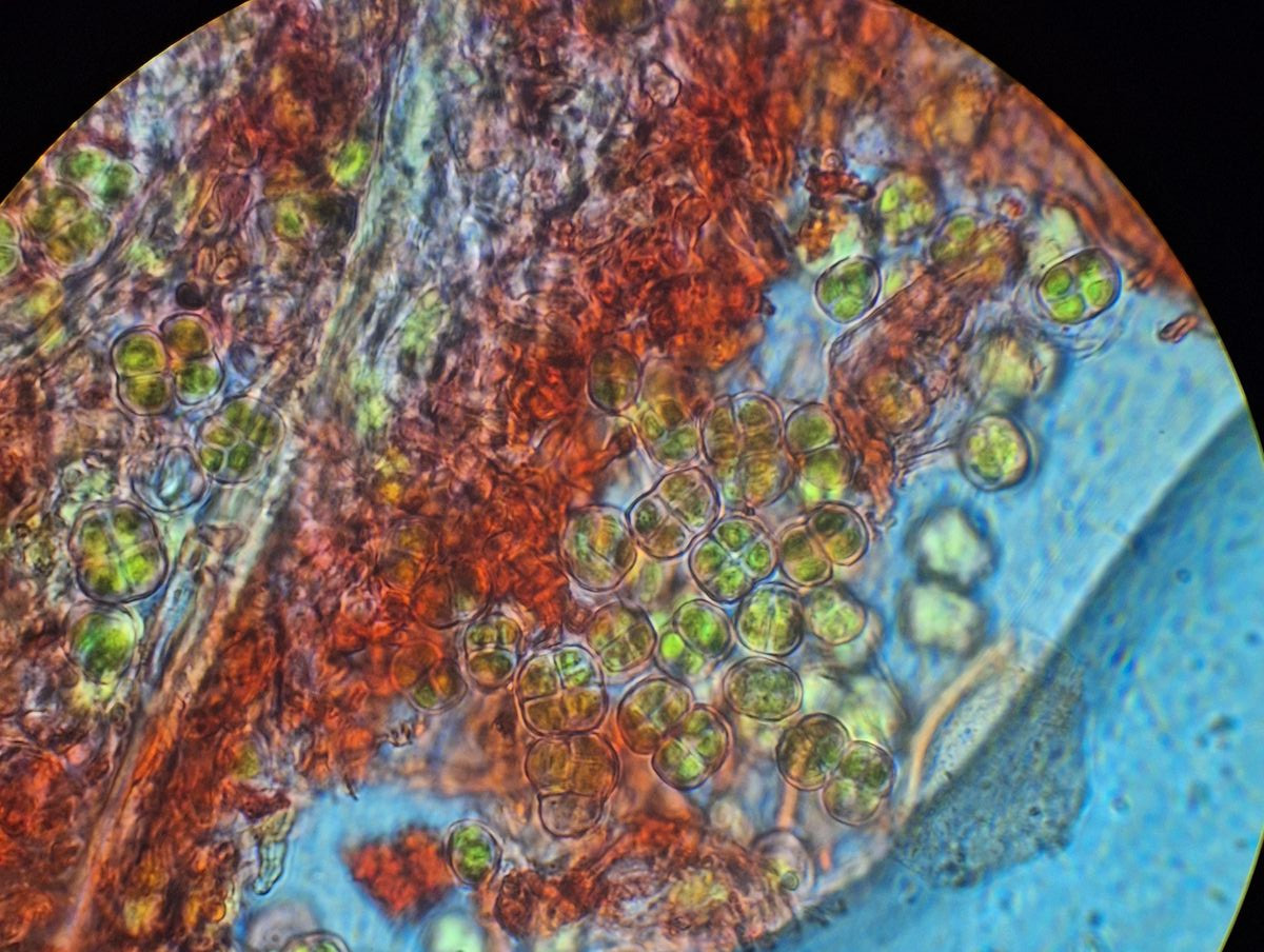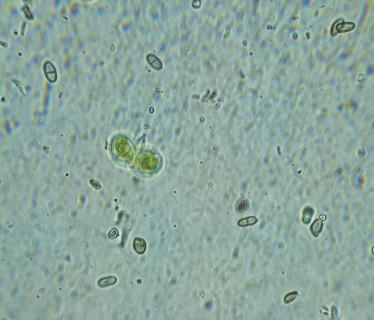 Sporen meist septiert, gelegentlich sogar eingeschnürt. Bis 7*3,5 µm. Septum gut ausgeprägt. Leicht braun pigmentiert. Viele auch unseptiert. Die sind dann kleiner und schlanker. Algen grün, mehrzellig.