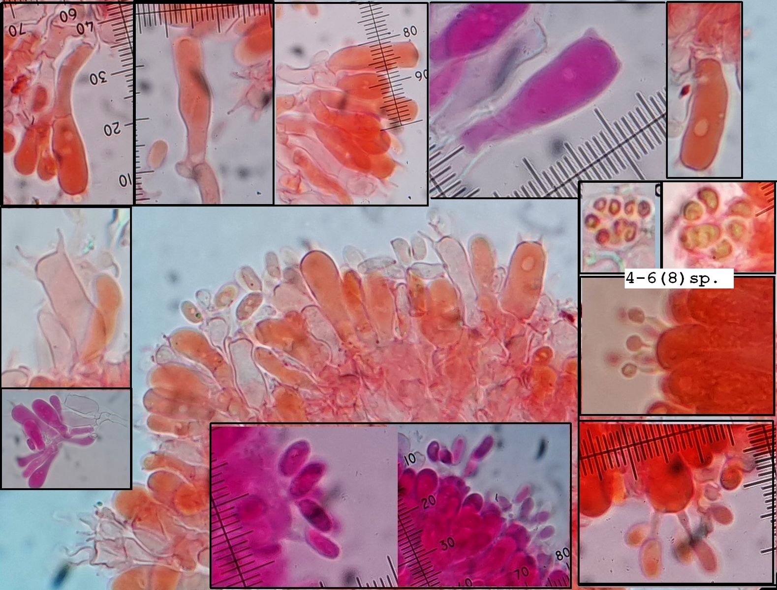 Bas: 3-6(8~)sp., ca. 15-25µm x 4-5(6)µm, mit Schnallen, keulig-zylindrisch bis lang-zylindrisch, teils verbogen, manche schwach eingeschnürt, nicht urnenförmig (bis auf sehr wenige Ausnahmen). Auch der Hinweis von Frank Dämmrich, hier im Forum, auf das Zusammenfallen der Sterigmen nach Sporenabwurf war auffallend zu sehen.