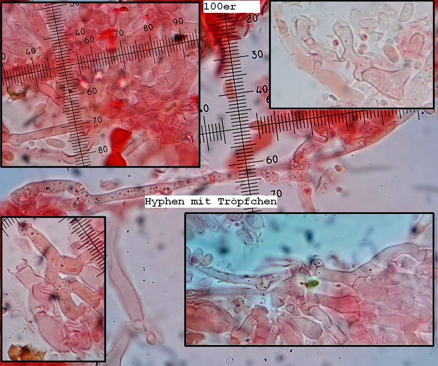 Subikulum-Hyphen: 4-6 (8)µm, +/-dickwandig, überwiegend kurzzellig und unregelmäßig verdickt, oft unregelmäßig verzweigt, mit deutlichen Öltropfen und Schnallen, wobei öfters mit Verdickungen an den Septen.