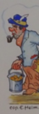 interessant, daß die "hässlicher" gezeichneten Figuren vom Künstler später so ein bißchen glattgebügelt wurden...dem "Geschwulstliebskarl" ist witzigerweise statt seiner Geschwulst im älteren Bild (sollte wohl einen Kropf darstellen?) in der neueren "schöneren" Version ein Halstuch "gewachsen". Lamprodermas Version ist allerdings eine Kopie von 1976 nach der Original-Zeichnung von 1942, wie man an der 2. Signatur links sieht.
