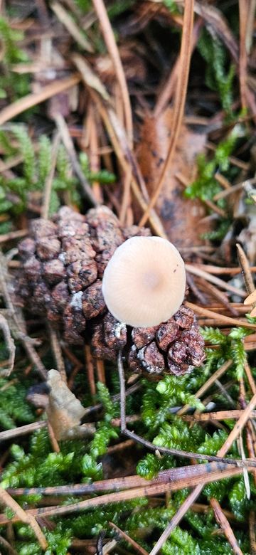 vergleiche mal mit Baeospora myosura. Bei den Kiefernapfenrüblingen sind die Stiele im unteren Teil deutlich gefärbt.
