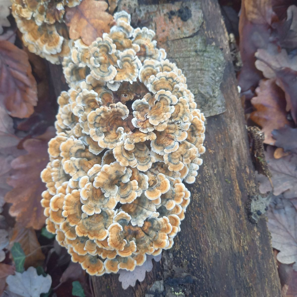 Zugegebenermaßen sind die nachfolgenden Informationen mehr als dürftig. Vielleicht hat aber doch jemand eine Idee, um was es sich handeln könnte. Mein Optimismus erklärt sich aus dem Vorhandensein der hellblauen Farbe auf dem Fruchtkörper. Die Fruchtkörper, die ich Mitte Dezember im Kottenforst bei Bonn gefunden habe, wuchsen auf einem abgebrochenen Buchenast (Durchmesser geschätzt 15 cm). Sie waren bis zu ca. 5 cm breit und sehr dünn, flexibel und leicht einzureissen. Das Hymenium war weiss und lamellenartig bis dädaloid. Ich habe nur das eine Foto gemacht, weil mit das Motiv so gut gefiel. Als ich zwei Wochen später mir ein paar Proben zum Mikroskopieren holen wollte, war die Pracht komplett verschwunden.
