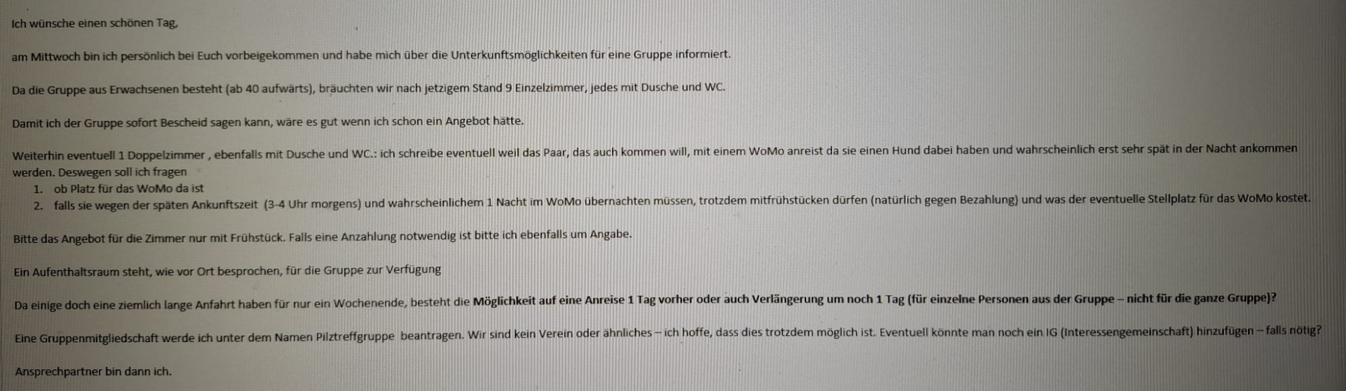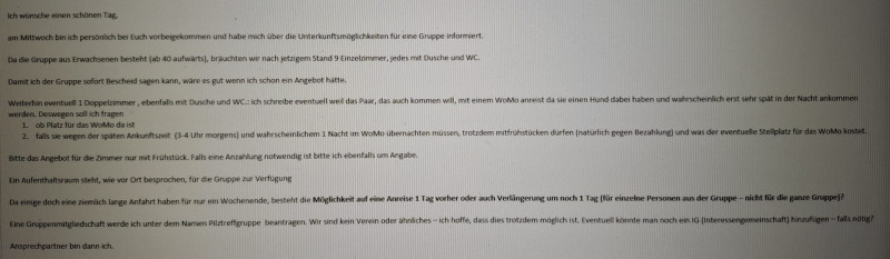 Die Jugendherberge hat trotz Angebot für unseren Termin einen etwas schrägen Rückzieher gemacht (vielleicht hatten sie eine Anfrage für eine vollere Zimmerbelegung…), sie hätten eigentlich nur 2 Einzelzimmer und überhaupt gäbe es nun eine andere Gruppe u.s.w. Dodo war entsprechend sauer, hat aber eine super Alternative gefunden und gleich gebucht, da es sonst eng wird! Sie hat 300 Euro Anzahlung geleistet und wird Euch alle wegen der Bankverbindungen anschreiben, und die jeweiligen Zimmerpreise bei Euch einsammeln, um dann später den Gesamtbetrag zahlen zu können.