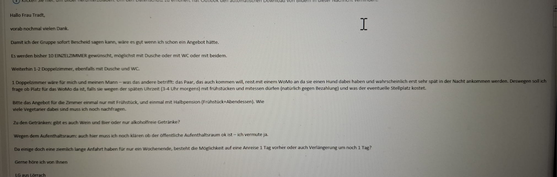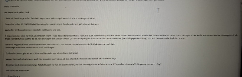 So ich bin jetzt in mich gegangen, würde kommen, aber einen Tag früher anreisen und einen Tag später abreisen, sonst wäre mir das zu stressig und bitte Einzelzimmer. Ich rechne mit 10-11 Stunden Fahrt. Die Angaben nach Routenplaner kommen ja nie hin.