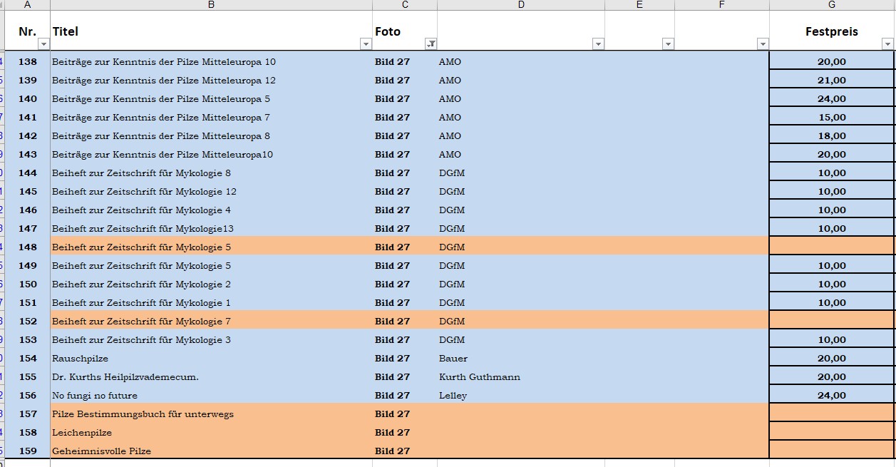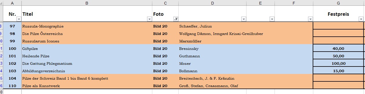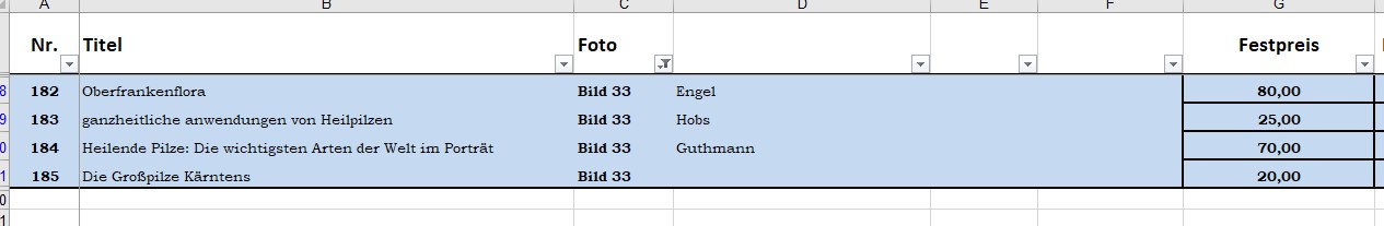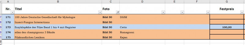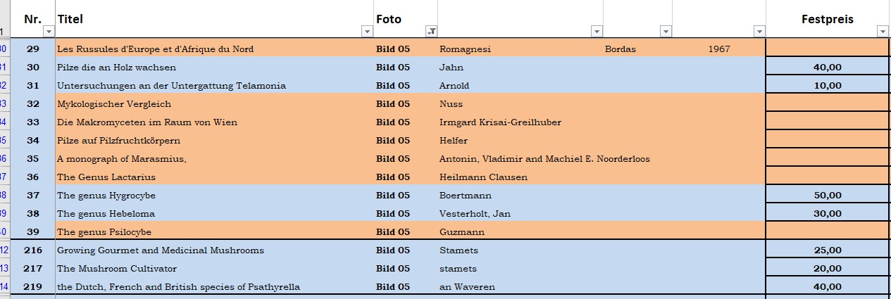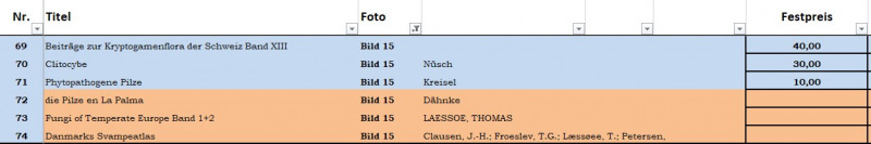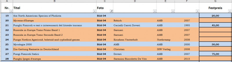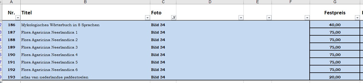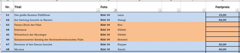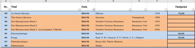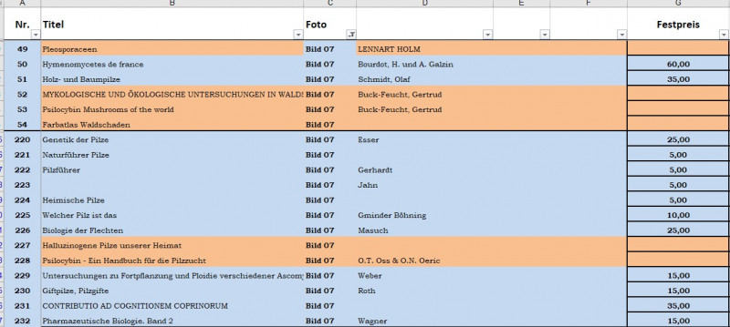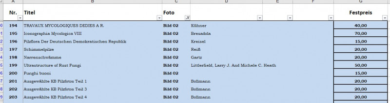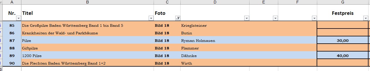 Mir liegen 34 Fotos aus Ihren Bücherregalen vor, davon habe ich eine Exceldatei erstellt und mit VB Preisen versehen.