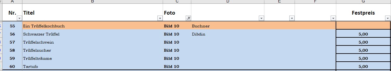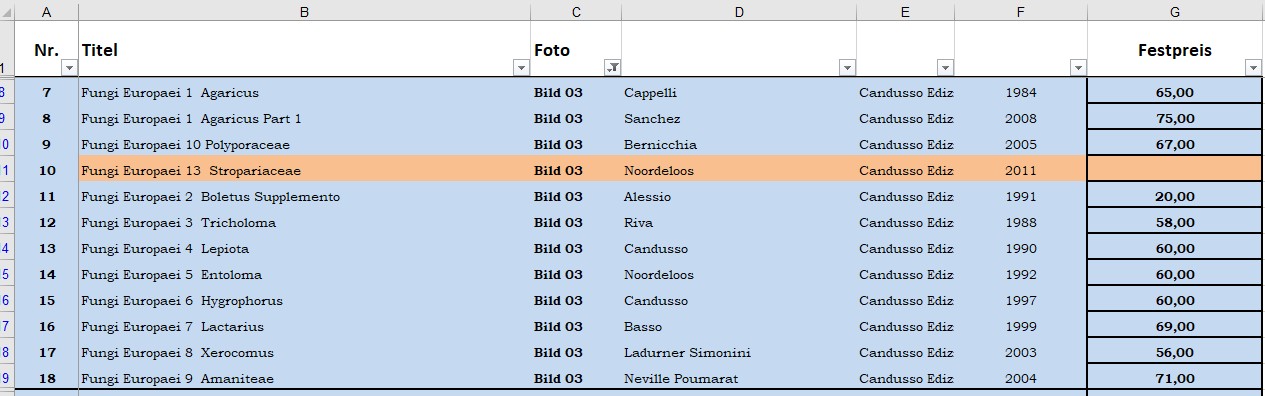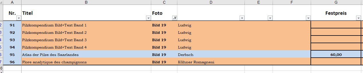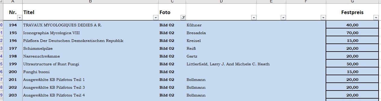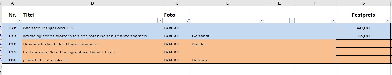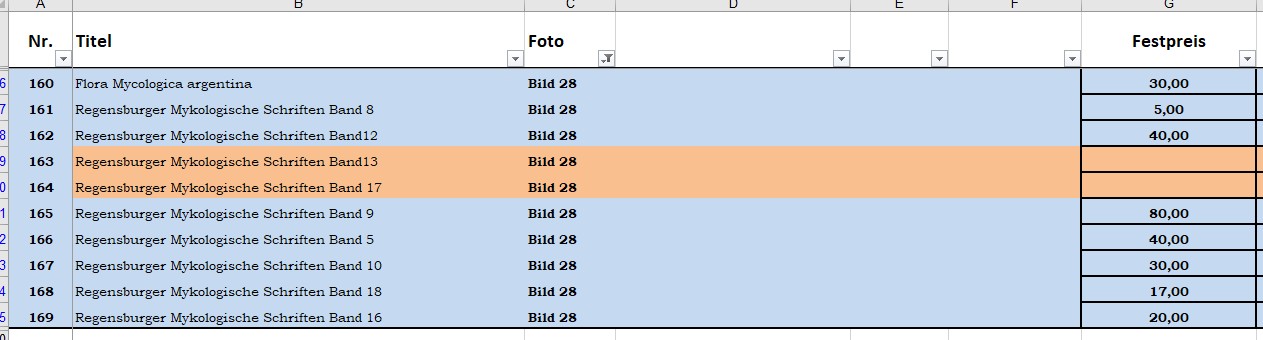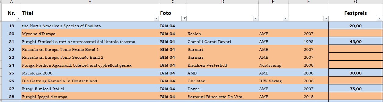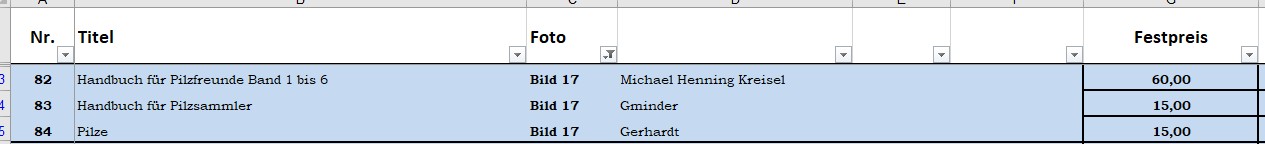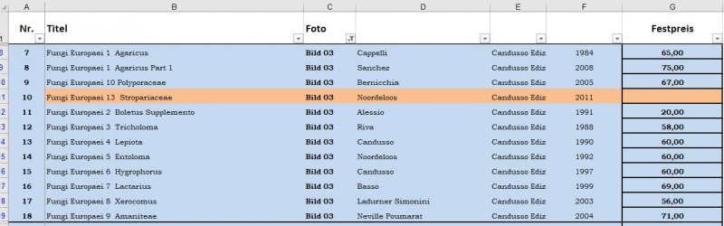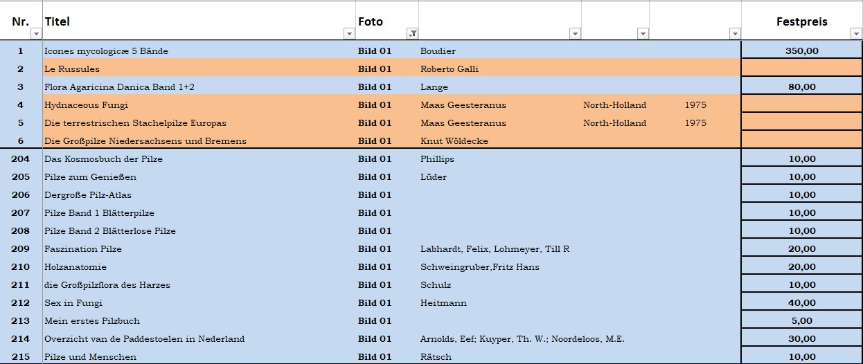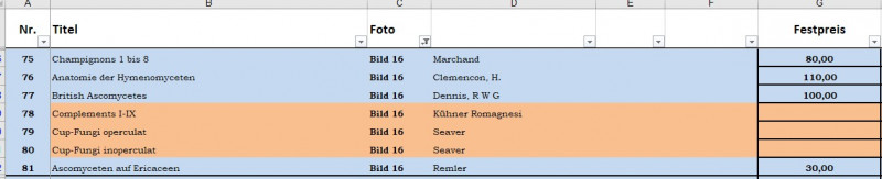 Mir liegen 34 Fotos aus Ihren Bücherregalen vor, davon habe ich eine Exceldatei erstellt und mit VB Preisen versehen.