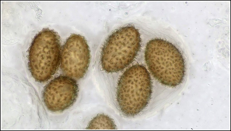 Das mir zugesandte Fruchtkörperfragment zeigte die typischen, stacheligen "melanosporum"-Sporen. Diesmal konnte die Bestimmung bestätigt werden. Das Bäumchen stammt von einem "Trüffelzüchter" aus der Gegend, der auf seinen Plantagen in diesem Jahr weitere Erfolge mit der Perigordtrüffel erzielen konnte.