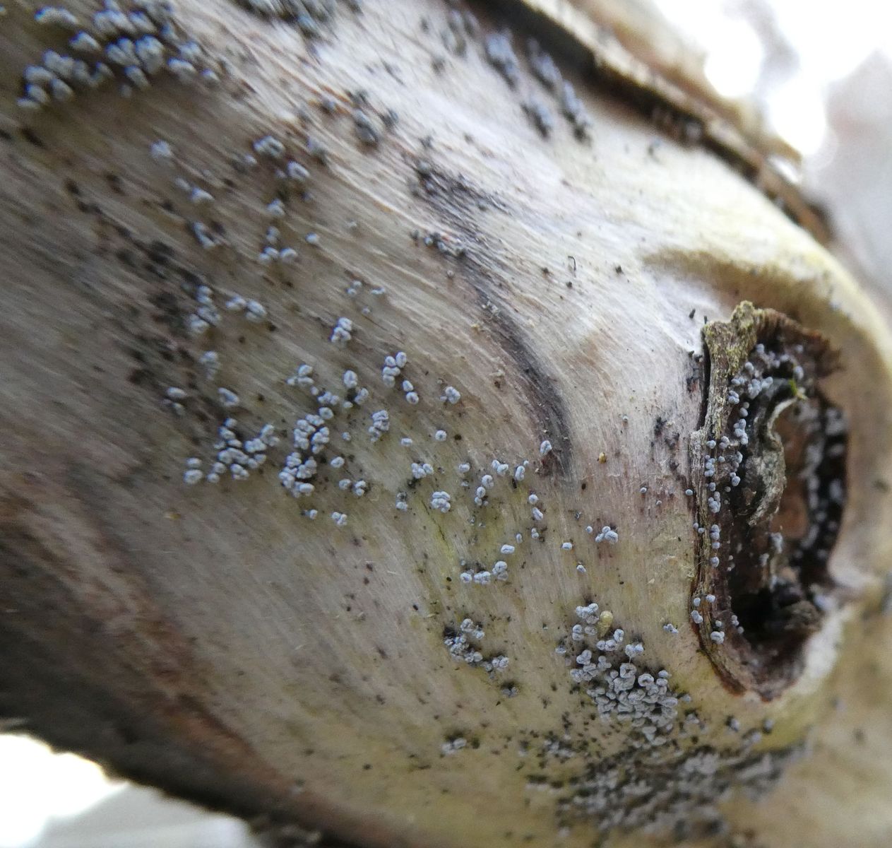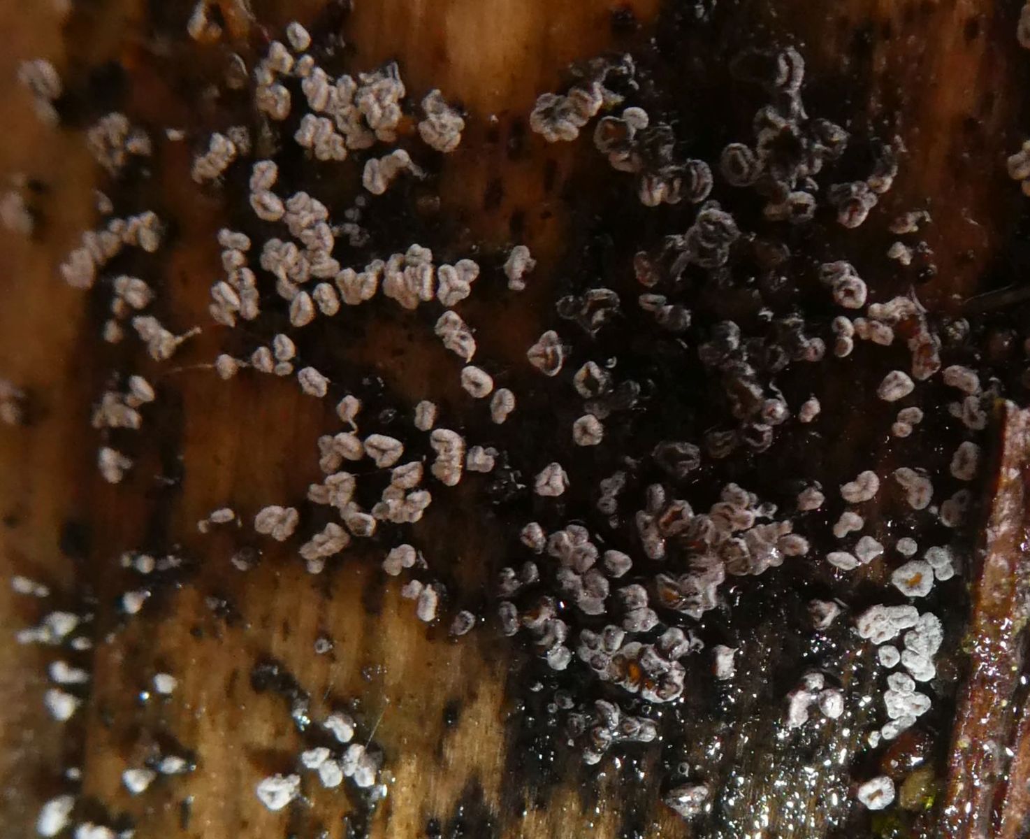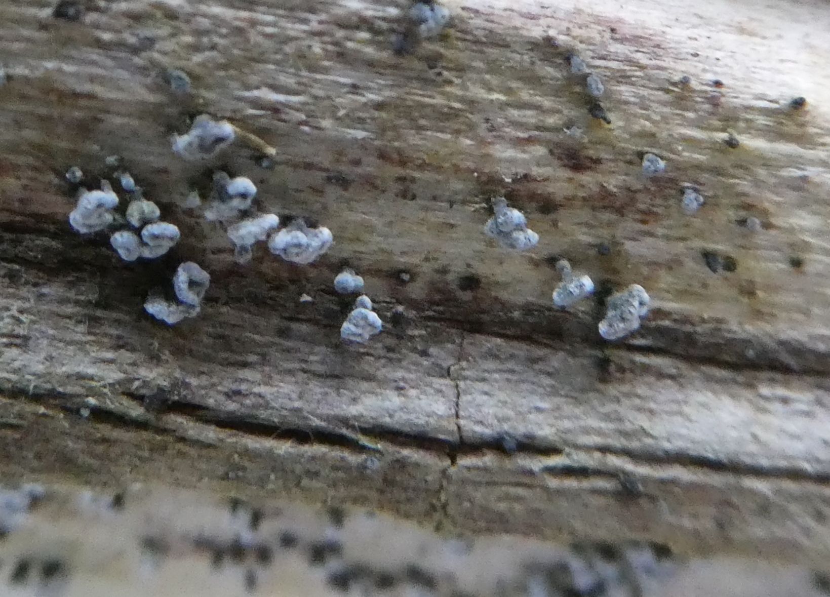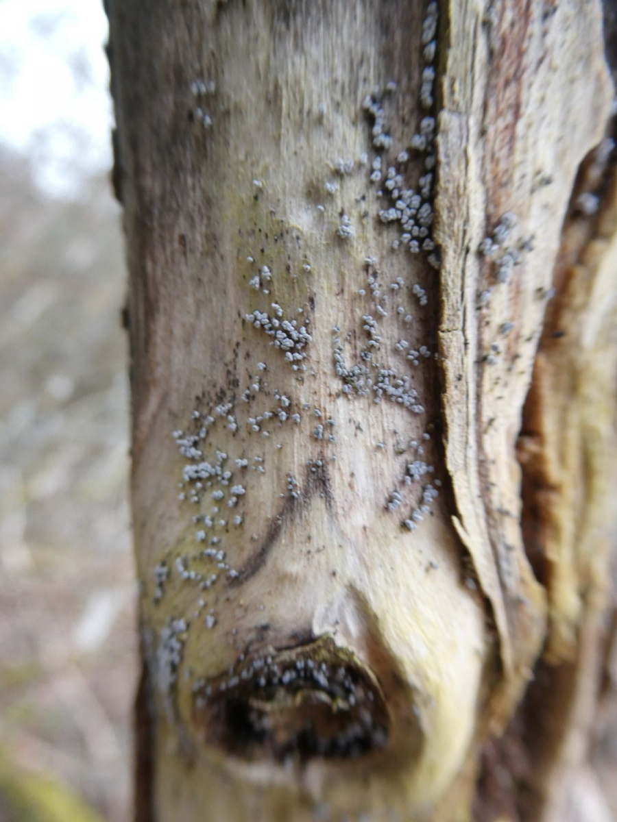Inzwischen schließe ich auch eine Flechte nicht aus, so aus der Richtung Stecknadelköpfchen, bei denen ist das Lager/Hyphen auch im Holz versteckt,