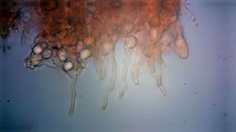 bei Radulomyces confluens solltest du aber Schnallen finden. Meiner Erfahrung nach geht das am besten, wenn man ein kleines Stück Pilz erstmal in Phloxin (färbt nur den Zellinhalt, wodurch alles etwas übersichtlicher wird) gibt, wartet bis das Phloxin komplett eingetrocknet ist. Dann mit Wasser auswaschen und anschließend das gefärbte Stück Pilz in KOH geben. Da gerne kurz einweichen lassen und anschließend mit zwei feinen Nadeln noch mal so weit wie möglich zerzutzeln. Deckglas drauf (idealerweise hat man zu diesem Zeitpunkt einen relativ großen Flüssigkeitstropfen, so daß das Deckglas etwas aufschwimmt, das hilft meiner Erfahrung nach beim Klopfen im nächsten Schritt), mit einem Radiergummi draufklopfen (das erfordert etwas Übung zwischen es passiert nichts und alles ist Brei) und dann auf die Schnallensuche begeben.