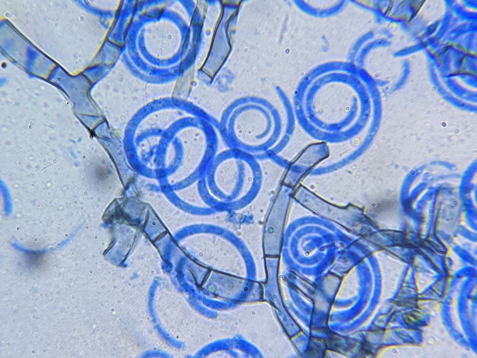 auf freiem Feld lag ein Haufen mit deutlich angewitterten Hackschnitzeln. Leidern habe ich keine Idee über die Baumart, aber ich vermute Laubholz. Ich nahm eine Handvoll mit und mikroskopierte. Hier die Befunde: