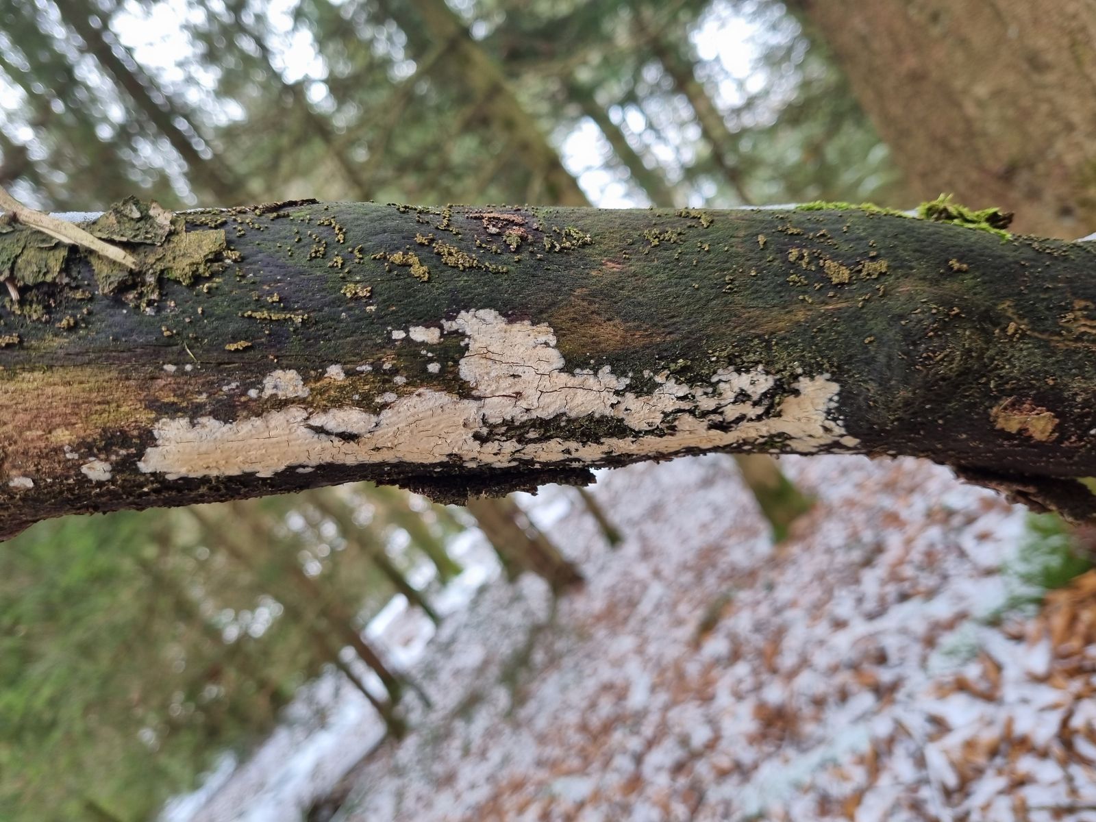 am 20.02.2026 haben meine Partnerin und ich einen weißen corticioiden Pilz gefunden, dem wir bisher keinen Namen entlocken konnten. Er wuchs rein resupinat auf einem toten, entrindeten, relativ dicken Ast, der noch mit dem stehenden Baum verbunden war: