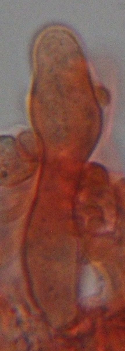 Auffällige Zystiden konnten wir nicht erkennen, allerdings war ein Objekt dabei, das unserer Ansicht nach gleichermaßen Basidie oder Zystide werden könnte: