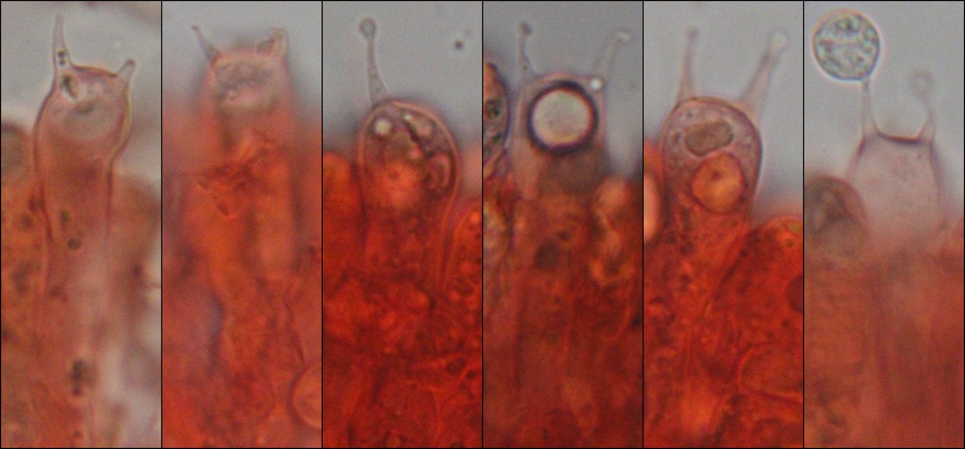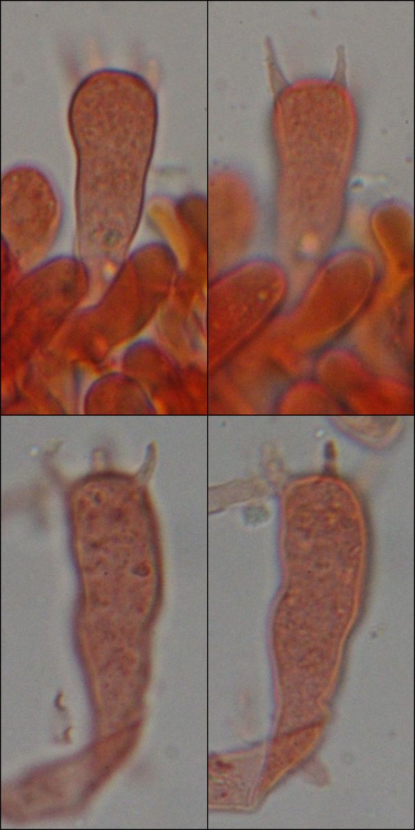 1. Schlüsselt man in Fungi Europaei rückwärts, erhält man „Basidia normally with 4 sterigmata“ (Koppel 169, S. 52). Auf meinen Bildern sieht man aber – bis auf die eine Ausnahme – zwei Sterigmen, selbst bei der Basidie mit Spore an einem Sterigma. Auch, wenn man die Tiefenschärfe verstellt, erkennt man nur zwei Sterigmen. Aber dann habe ich doch eine Basidie mit mehr als zwei Sterigmen gefunden. Im Übrigen, Armin, behauptest du, dass diese Basidie viersporig ist, weil du vier Sterigmen siehst, oder weil es keine dreisporigen Sterigmen gibt?