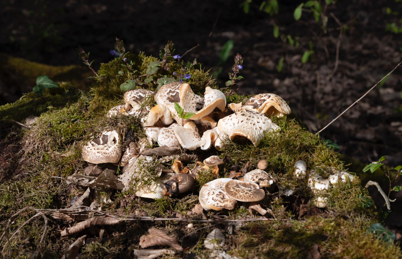 Fundort: Mischwald, alter Baumstumpf (vermutlich Buche), helle Stelle aber im nordseitigen Schatten gewachsen.
