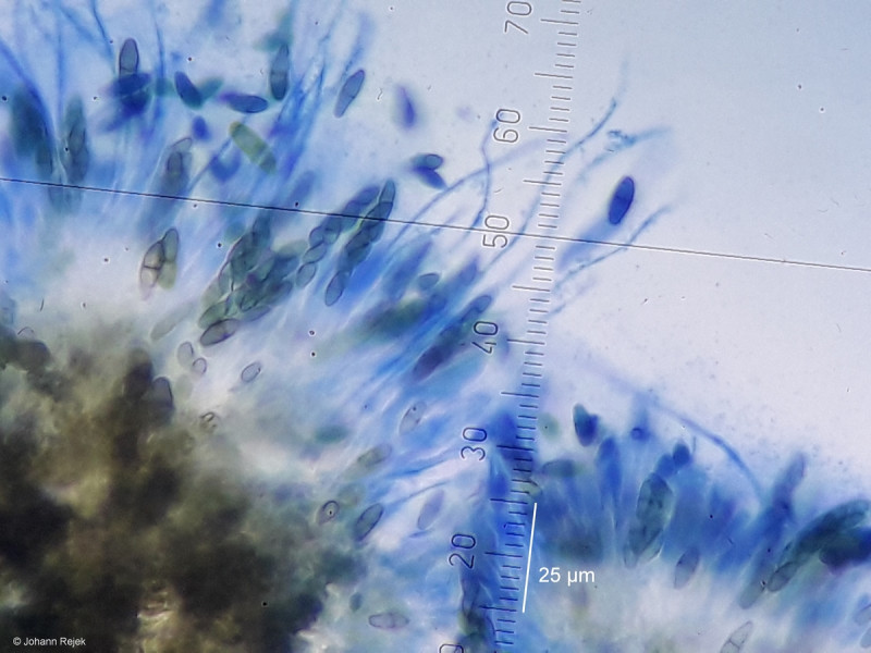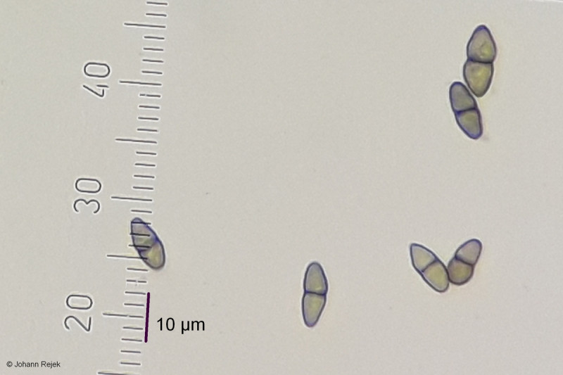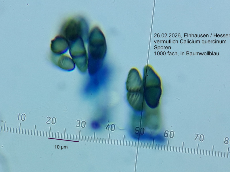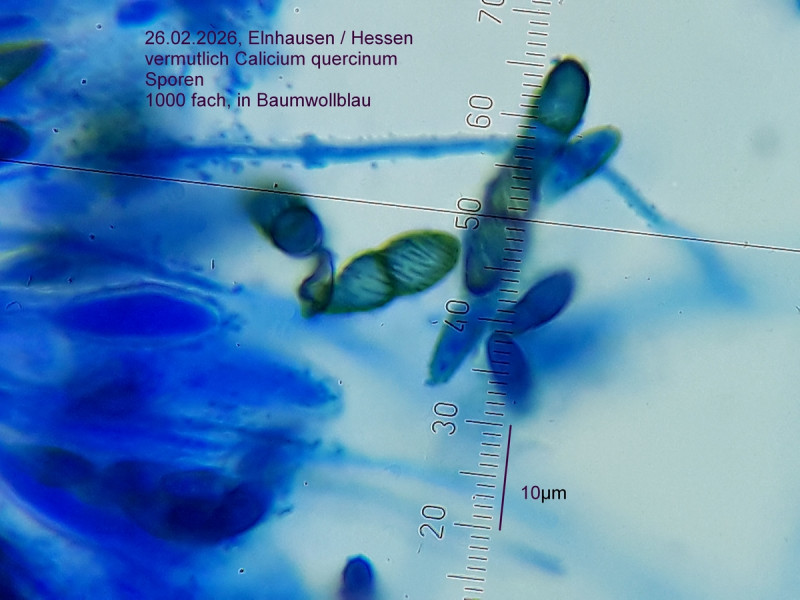 • Hallo Johann, das sieht schon ganz gut. Die spiraligen Linien werden in der Literatur oft erwähnt - bei mehreren Arten - so schick habe ich die selbst noch nicht gesehen. Calicium-Sporen sind je nach Alter sehr variabel, bei Dir sind die recht frisch den Asci entwichen und noch nicht breit und rissig. Es sieht ja so aus, als ob der Thallus dazugehört. Hast Du Dir auch die Algen angeschaut? Eigentlich kommt damit dann nur noch C. quercinum in Frage - die weitaus häufigere C. glaucellum hätte eher keinen so ausgeprägten Thallus. Nur farblich fehlt mir etwas der Grauton an Stiel und Becher - ansonsten müsste das die schon sein. Du kannst ja mal mit meinem Beleg vergleichen Calicium quercinum