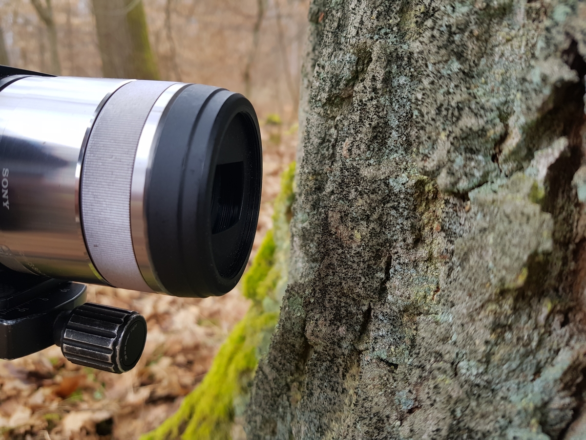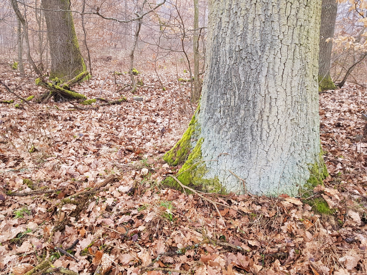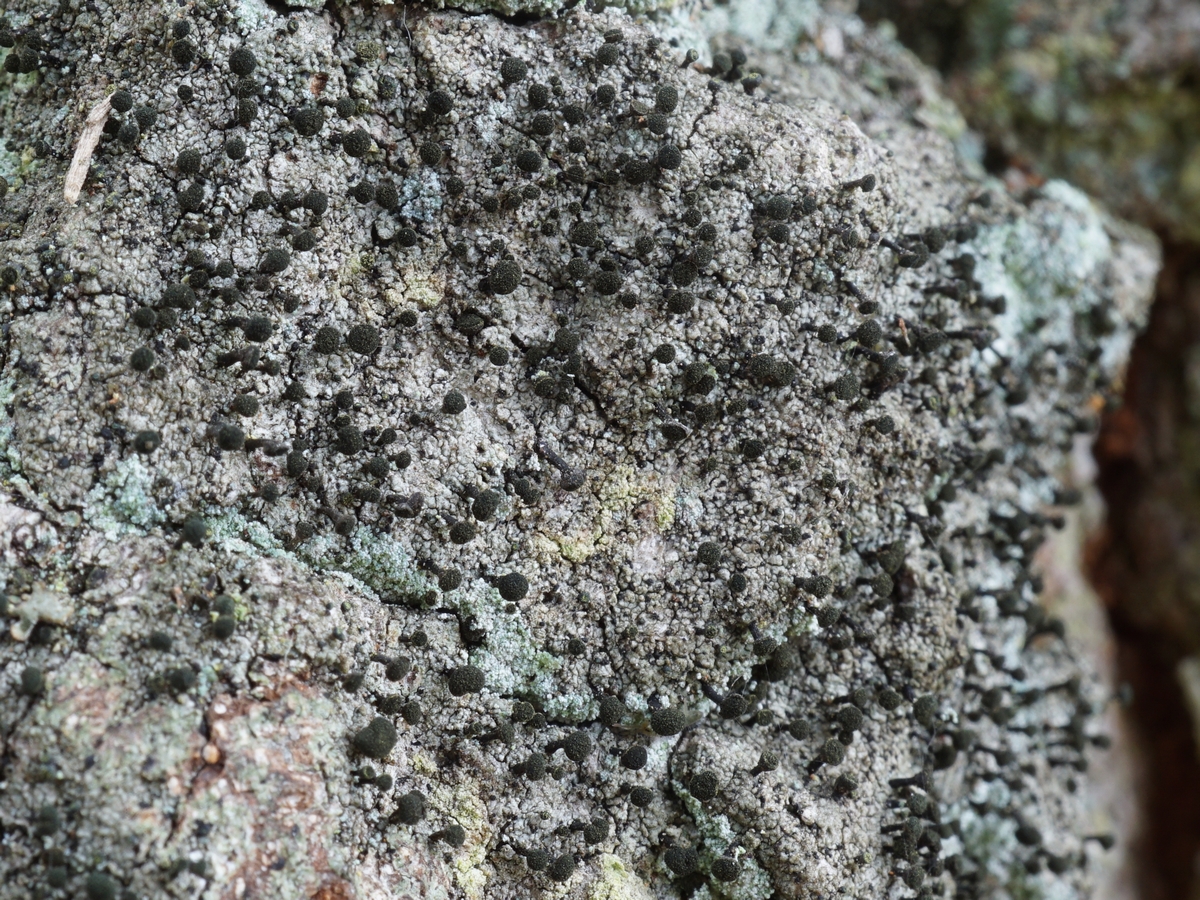 • Ende Februar 2026 war ich in Elnhausen / Hessen unterwegs und fand an der Rinde einer alten Eiche eine großflächige graue Flechte mit schwarzen „Stecknadeln“. Ich bin in der Flechtenbestimmung ein Anfänger … könnte das Calicium quercinum sein?