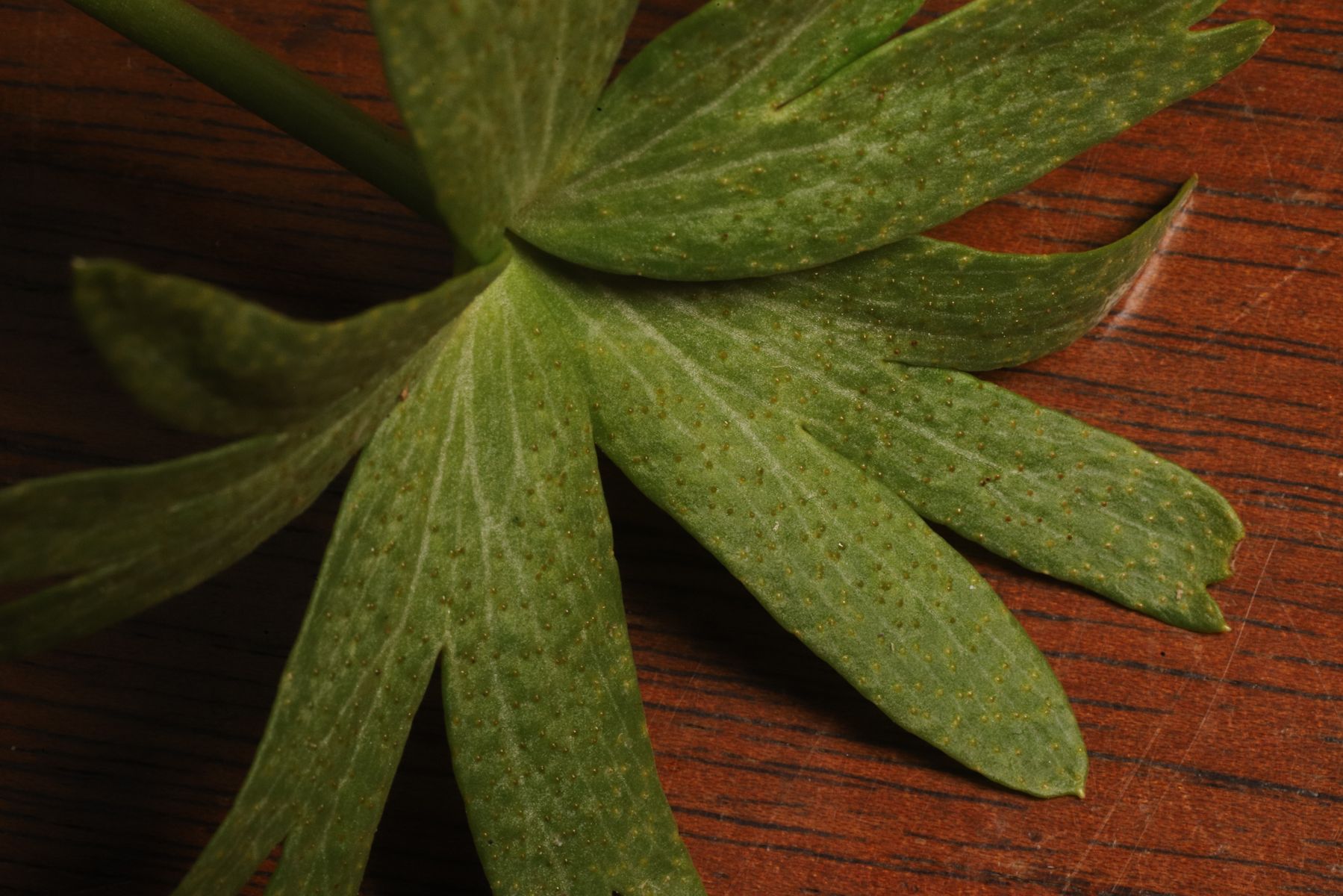 Leucotelium cerasi ex Eranthis hyemalis – Aecien blattunterseits, noch im Blatt und unreif (müssen sich noch öffnen)