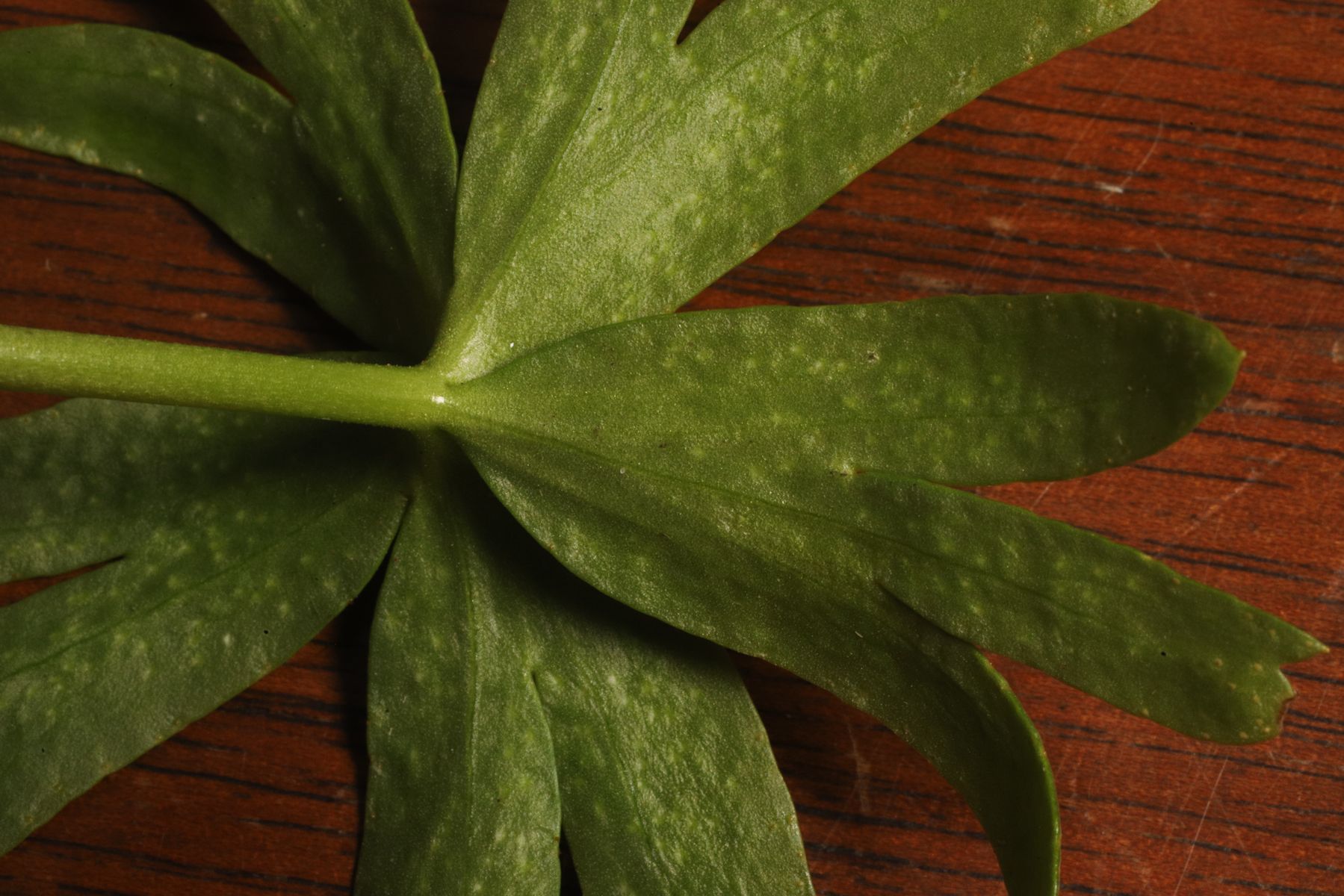 Leucotelium cerasi ex Eranthis hyemalis – Spermogonien an der Blattoberseite