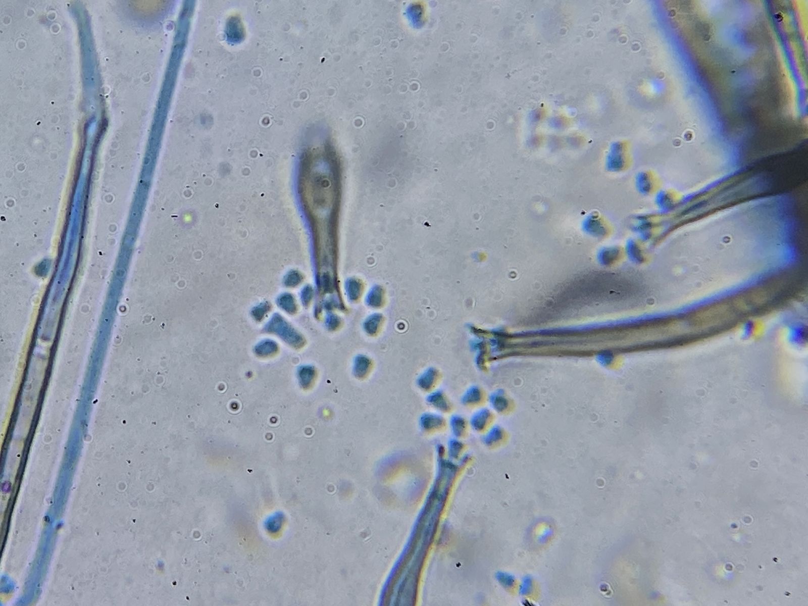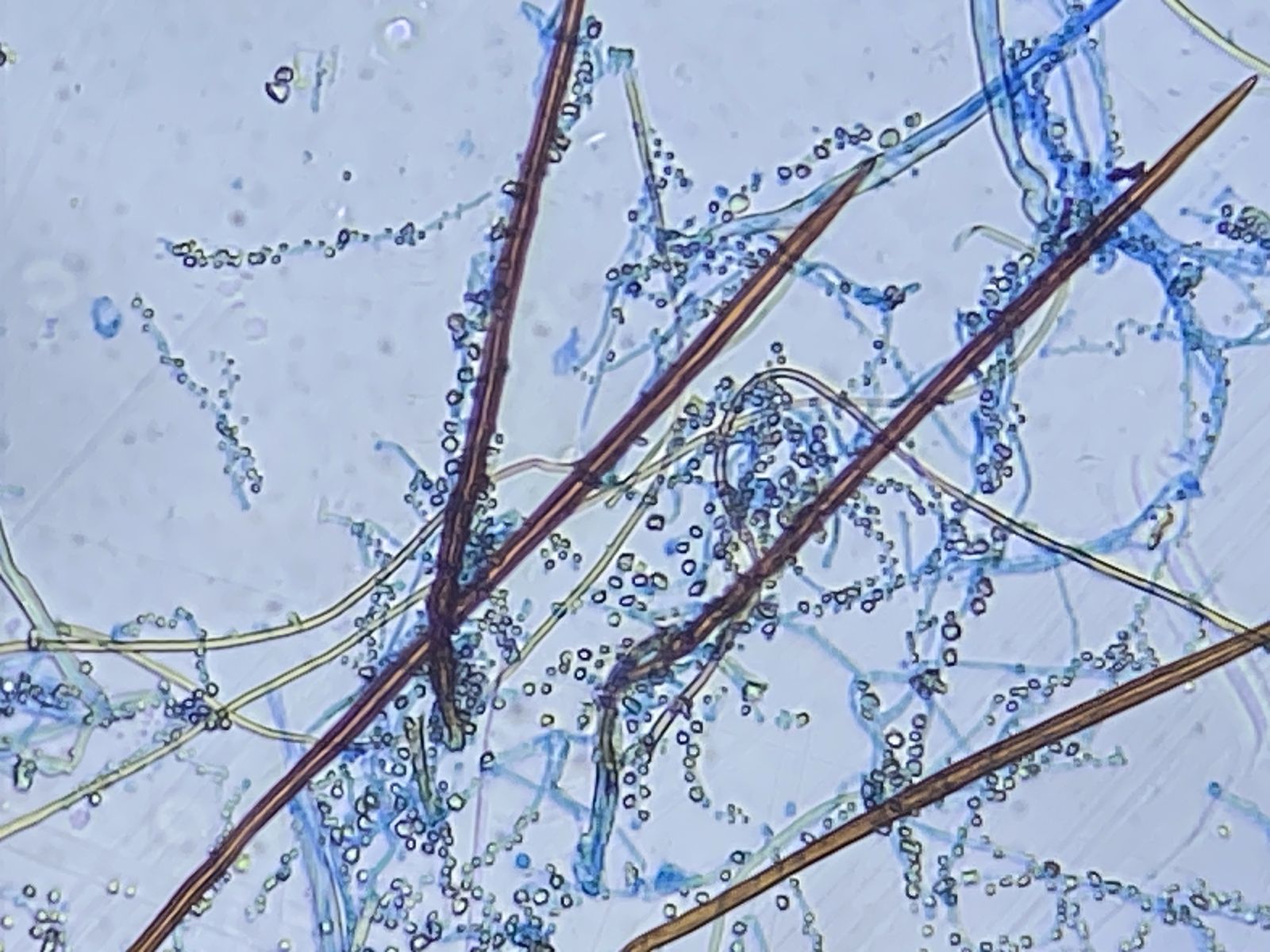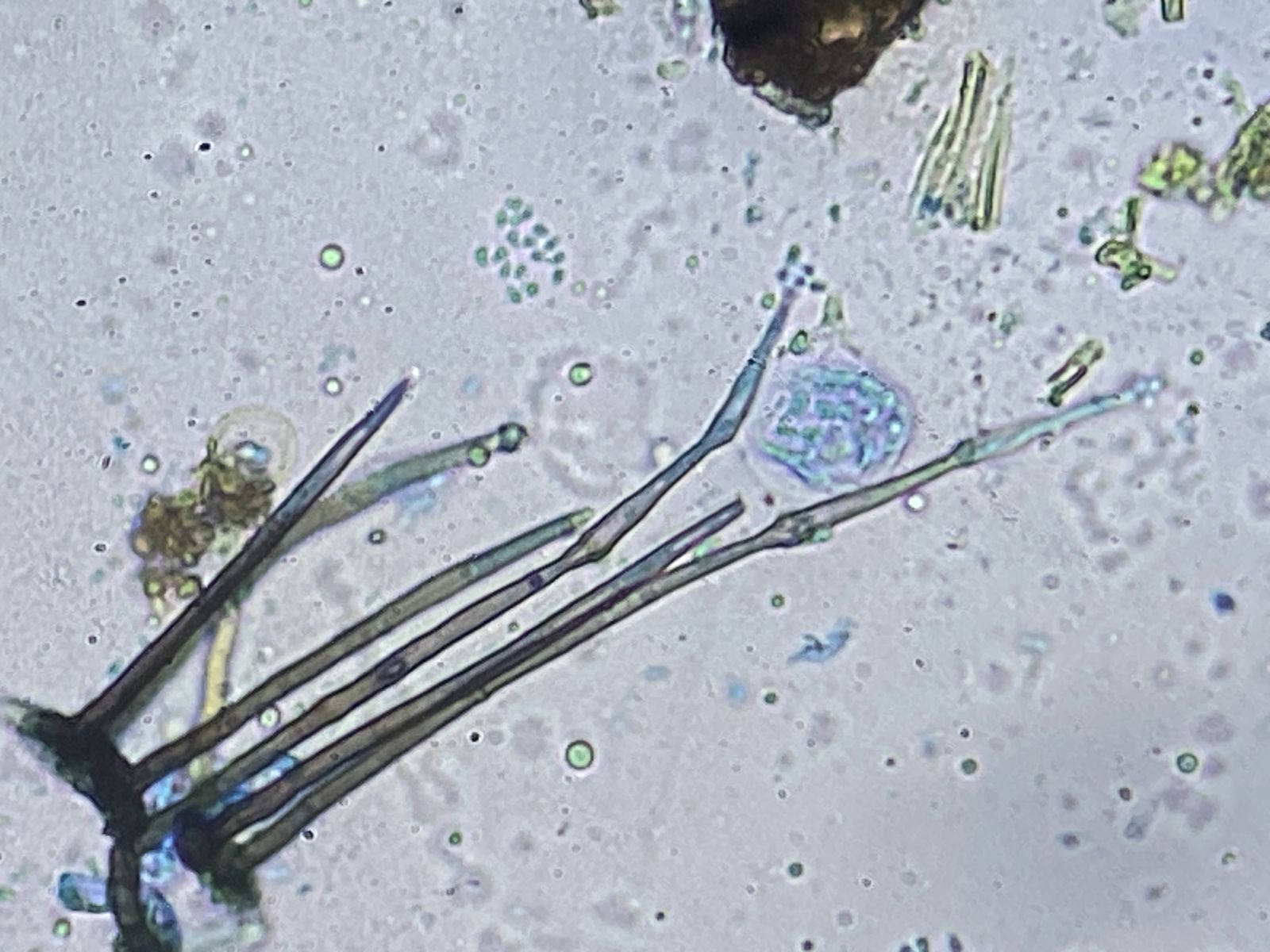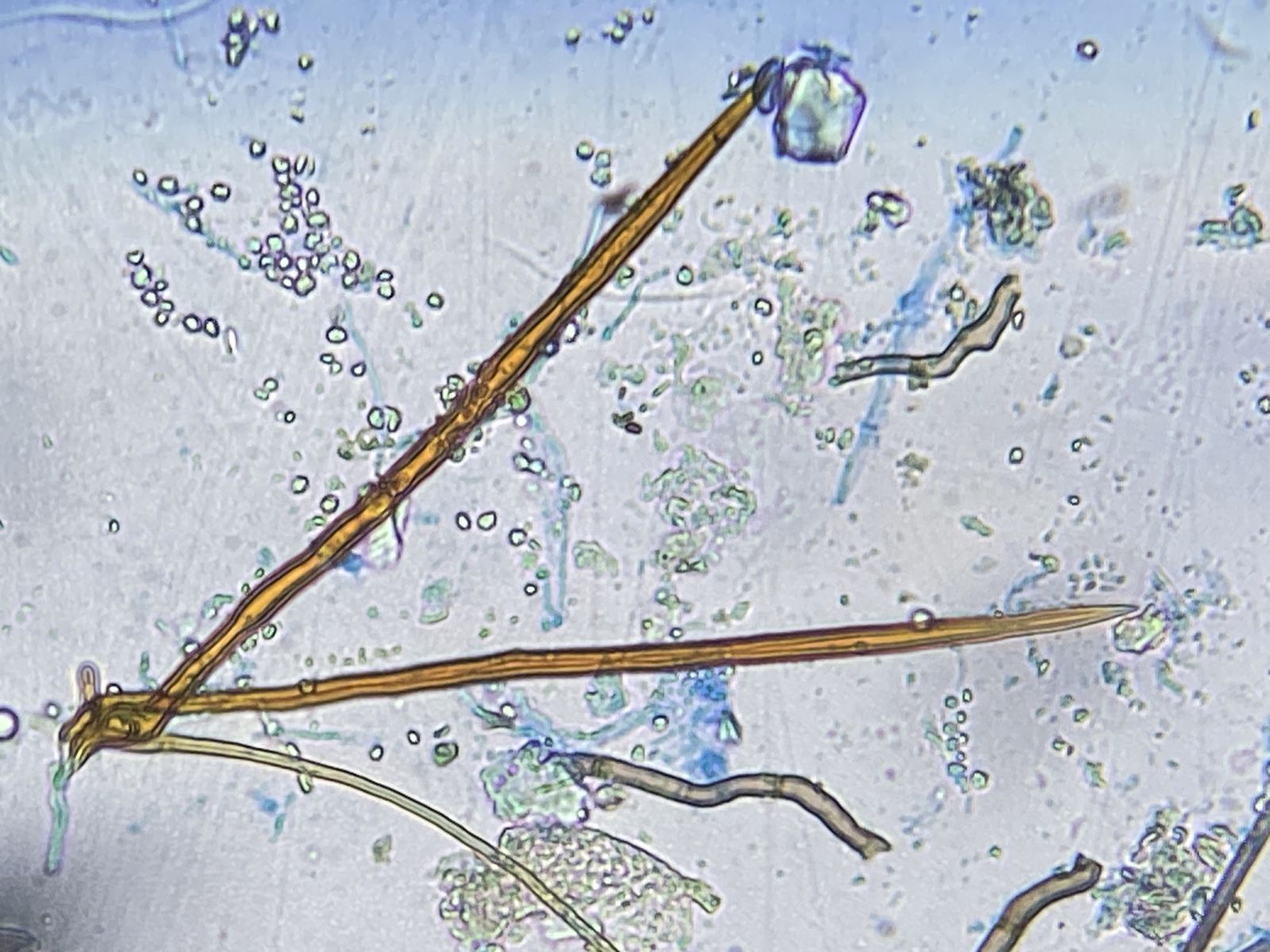 Zudem gab es in der gleichen Probe orange Setae und hyaline Hyphen mit eigenartigen Knöllchen daran (Knöllchenbakterien? Aber Rhizobium spp. sind stäbchenförmig). Dass diese zu den obengenannten Formen gehören, ist wohl eher nicht der Fall. Die Setae sehen eher nach Basidiomyceten aus (z.B. Haarschwindling = Crinipellis).