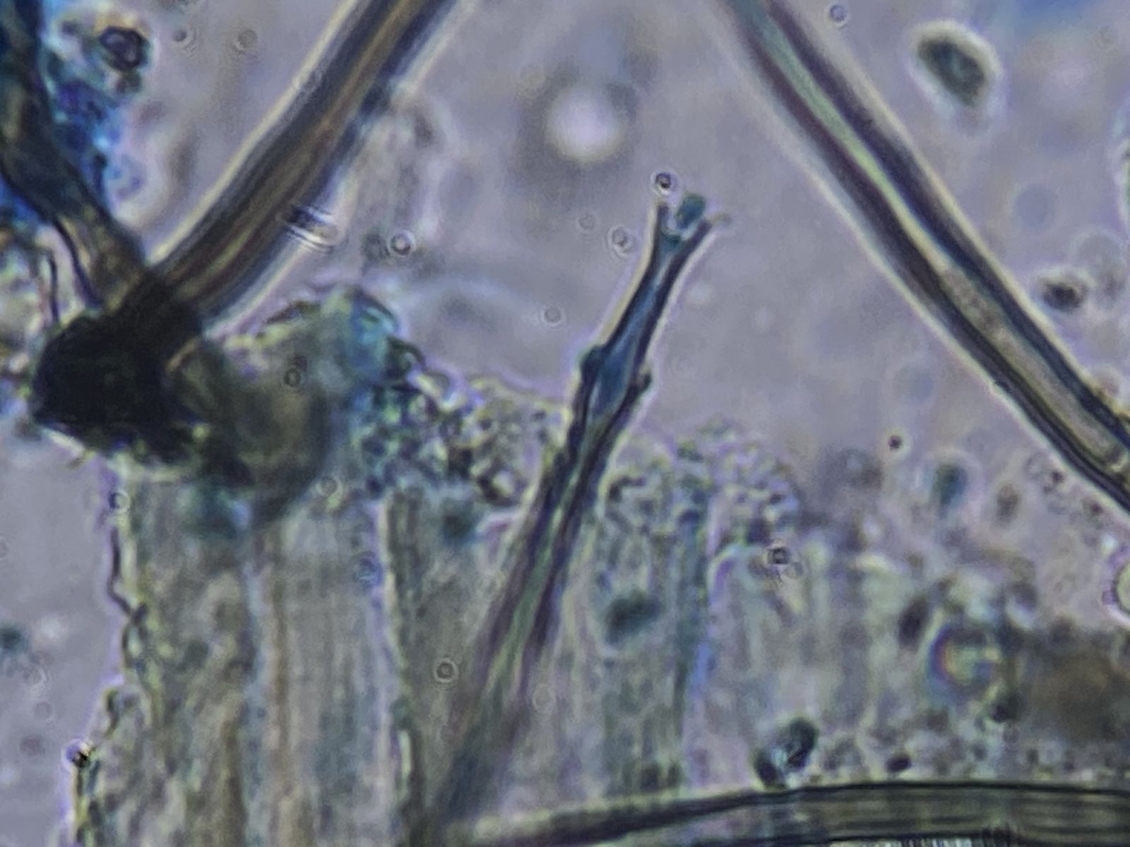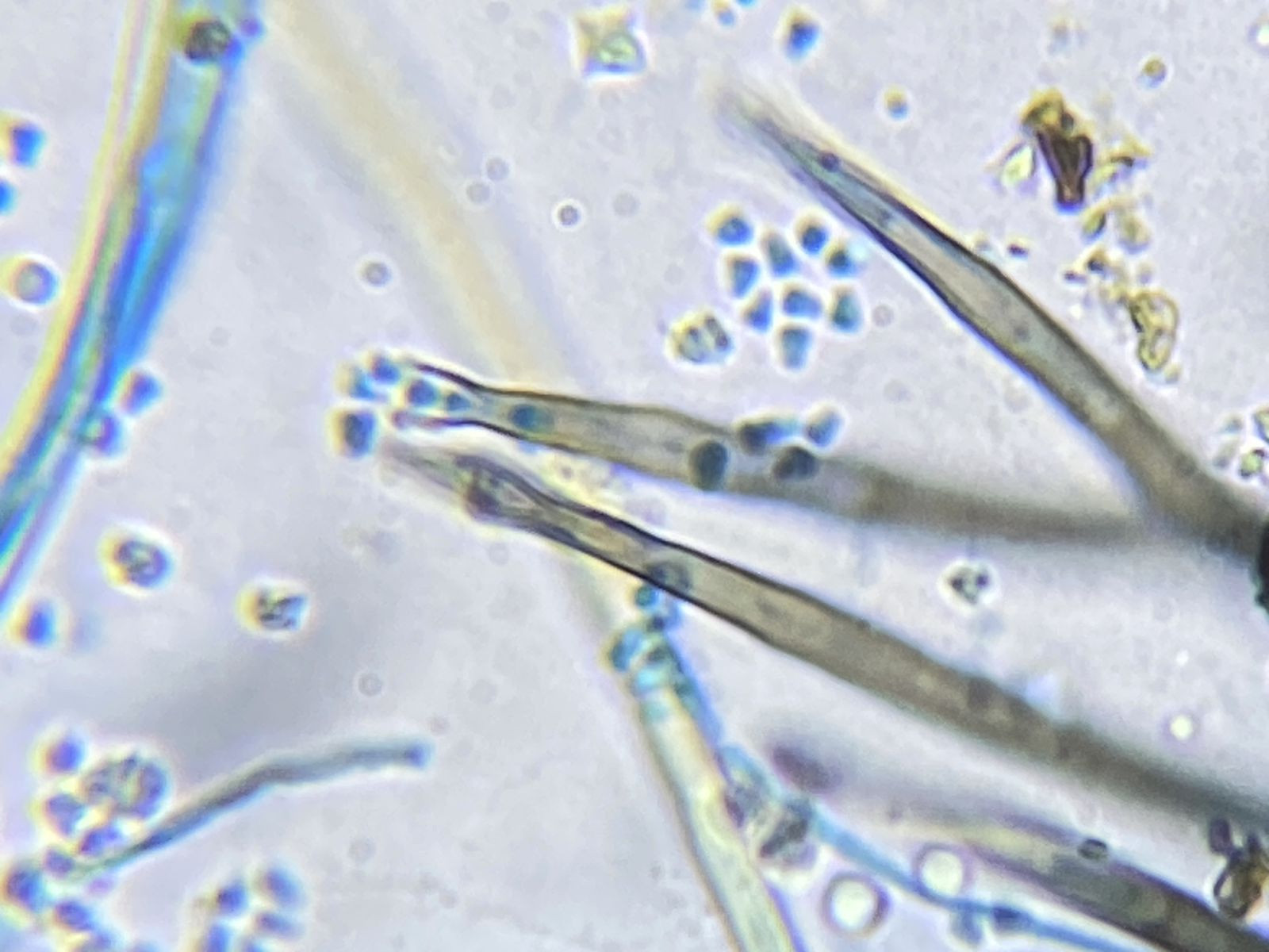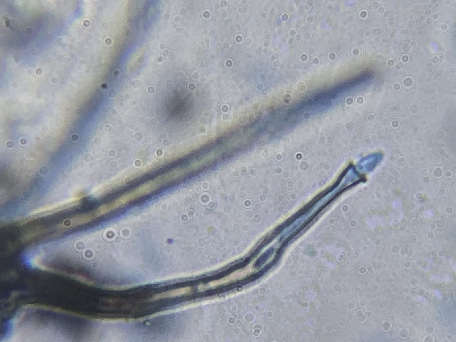 Zudem gab es in der gleichen Probe orange Setae und hyaline Hyphen mit eigenartigen Knöllchen daran (Knöllchenbakterien? Aber Rhizobium spp. sind stäbchenförmig). Dass diese zu den obengenannten Formen gehören, ist wohl eher nicht der Fall. Die Setae sehen eher nach Basidiomyceten aus (z.B. Haarschwindling = Crinipellis).