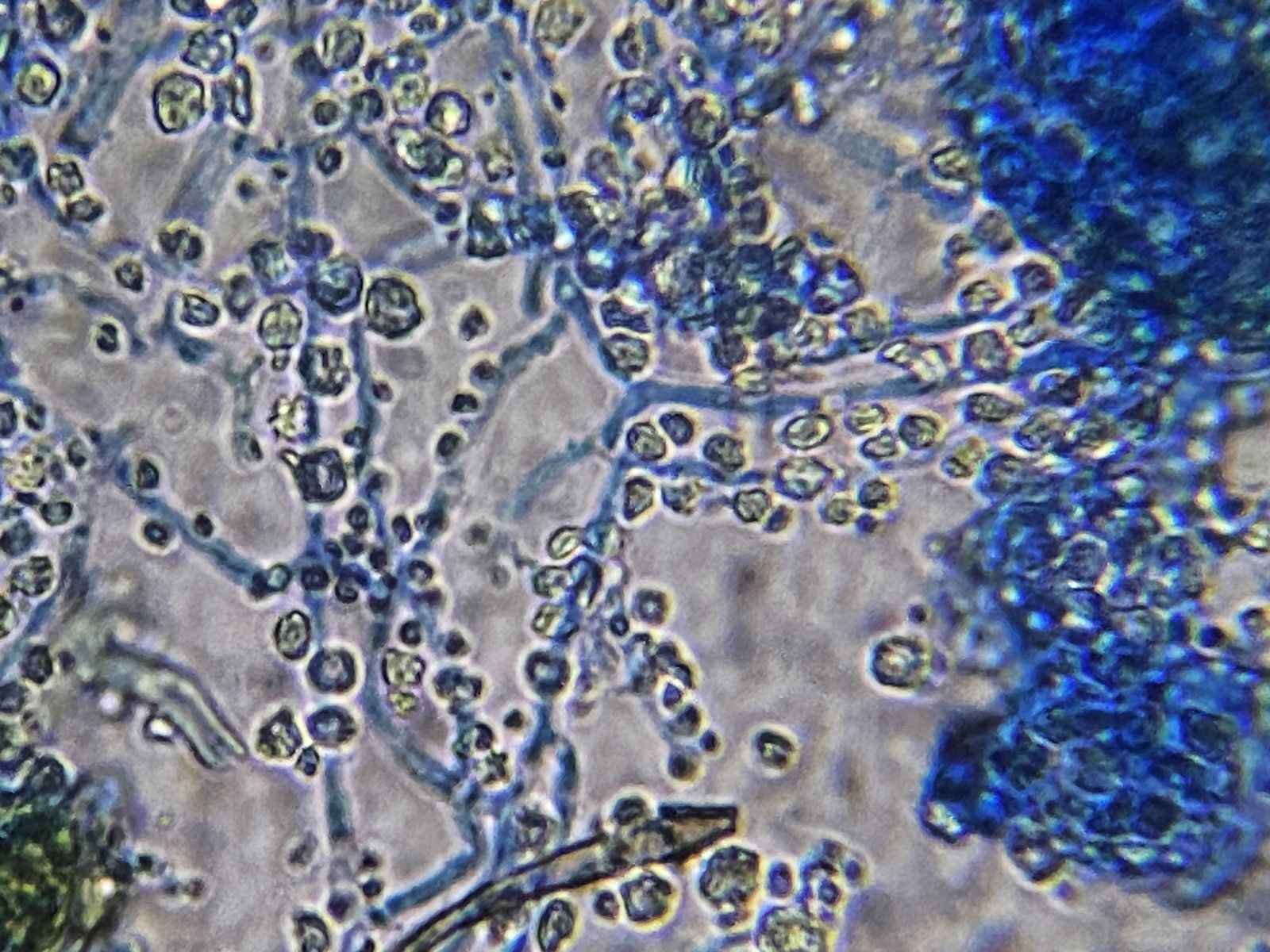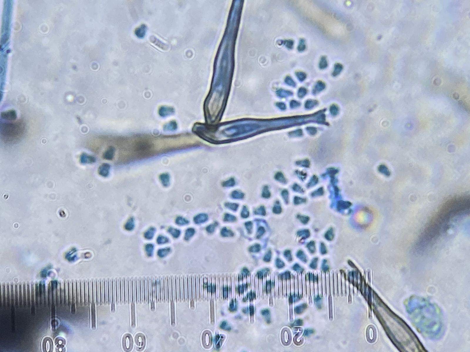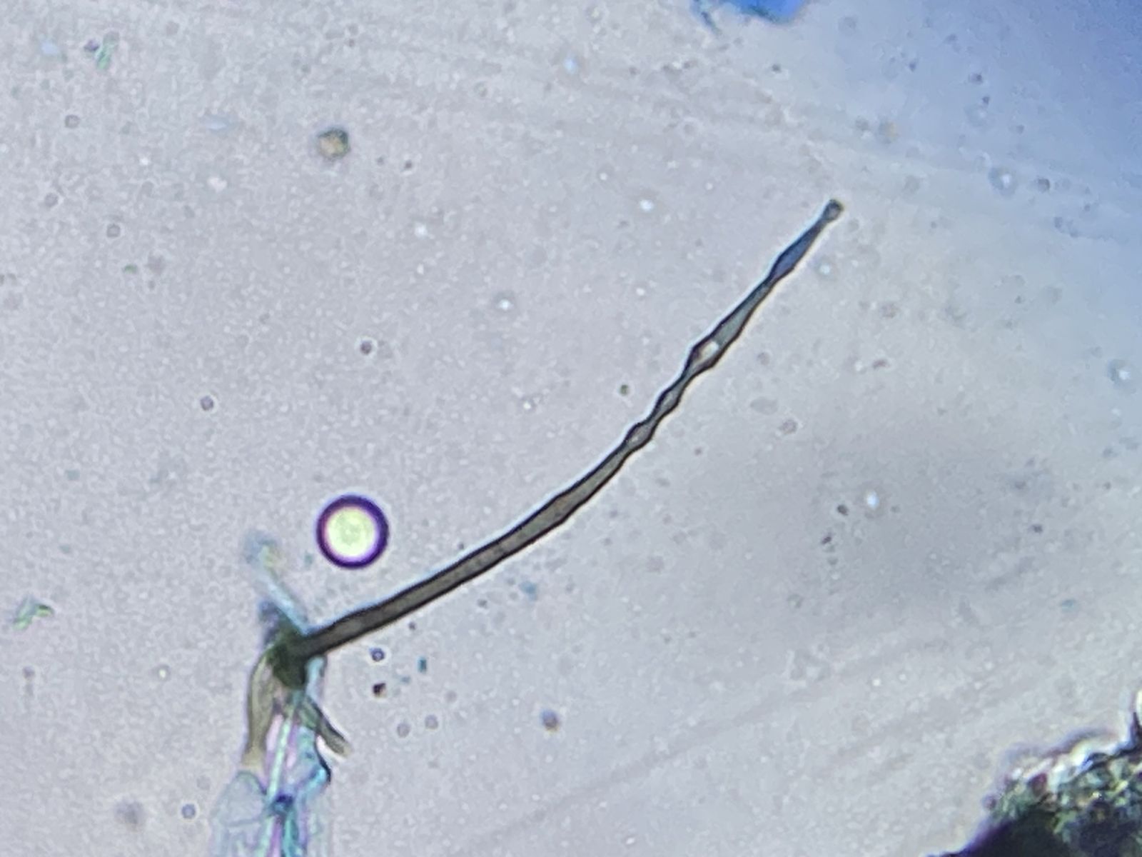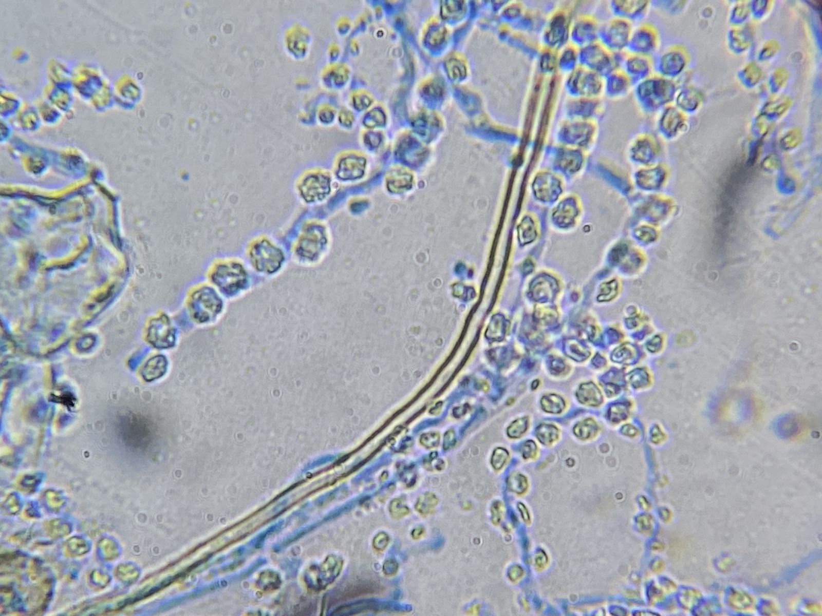 Zudem gab es in der gleichen Probe orange Setae und hyaline Hyphen mit eigenartigen Knöllchen daran (Knöllchenbakterien? Aber Rhizobium spp. sind stäbchenförmig). Dass diese zu den obengenannten Formen gehören, ist wohl eher nicht der Fall. Die Setae sehen eher nach Basidiomyceten aus (z.B. Haarschwindling = Crinipellis).