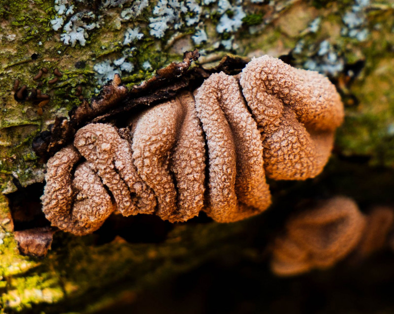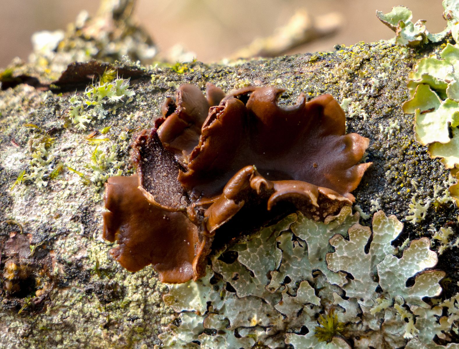 Auf der Rückfahrt zu mir nach Hause entdeckten wir direkt am Straßenrand eine stattliche Gruppe von Haselnusssträuchern. Sandra hatte Encoelia furfuracea, den Hasel-Kleiebecherling, bisher noch nie selbst gefunden. Also stoppte ich und wir suchten besagte Pilze. An einem der letzten Sträucher war es dann so weit: Auf stark morschem Holz – genau wie es sein soll – wurde sie fündig. ![]()