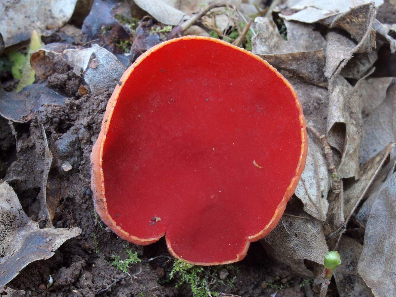 Rote Kelchbecherlinge an einer bekannten Stelle waren überständig und teilweise zerfressen. Nach einiger Suche fand sich dann doch noch ein fotogenes Exemplar.