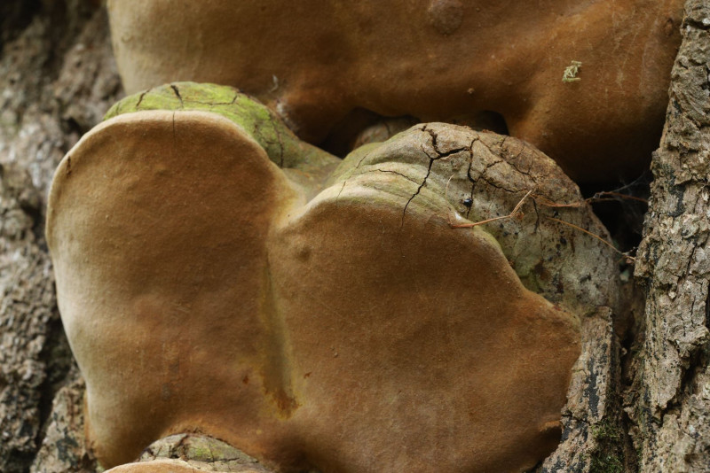ja, aber viel dezenter. Vergleich das mal mit den drei Fruchtkörpern, die Karl zeigt. Da hat der Fruchtkörper eine klare Kante, die einen senkrechten Bereich des Fruchtkörpers definiert (einen Knick sozusagen). Der senkrechte Bereich ist tief mit Jahres-/Saisonrillen versehen (hier sehr auffällig, gibt es auch bei Ganoderma). Dasist viel extremer als bei meinen Bildern und zudem ist die Anzahl der Ringe größer. Die Hutoberseite ist sehr hell, die Zuwachsringe in sich etwas ziseliert.