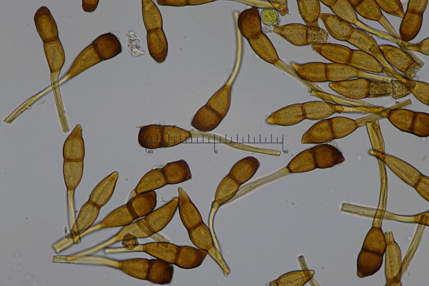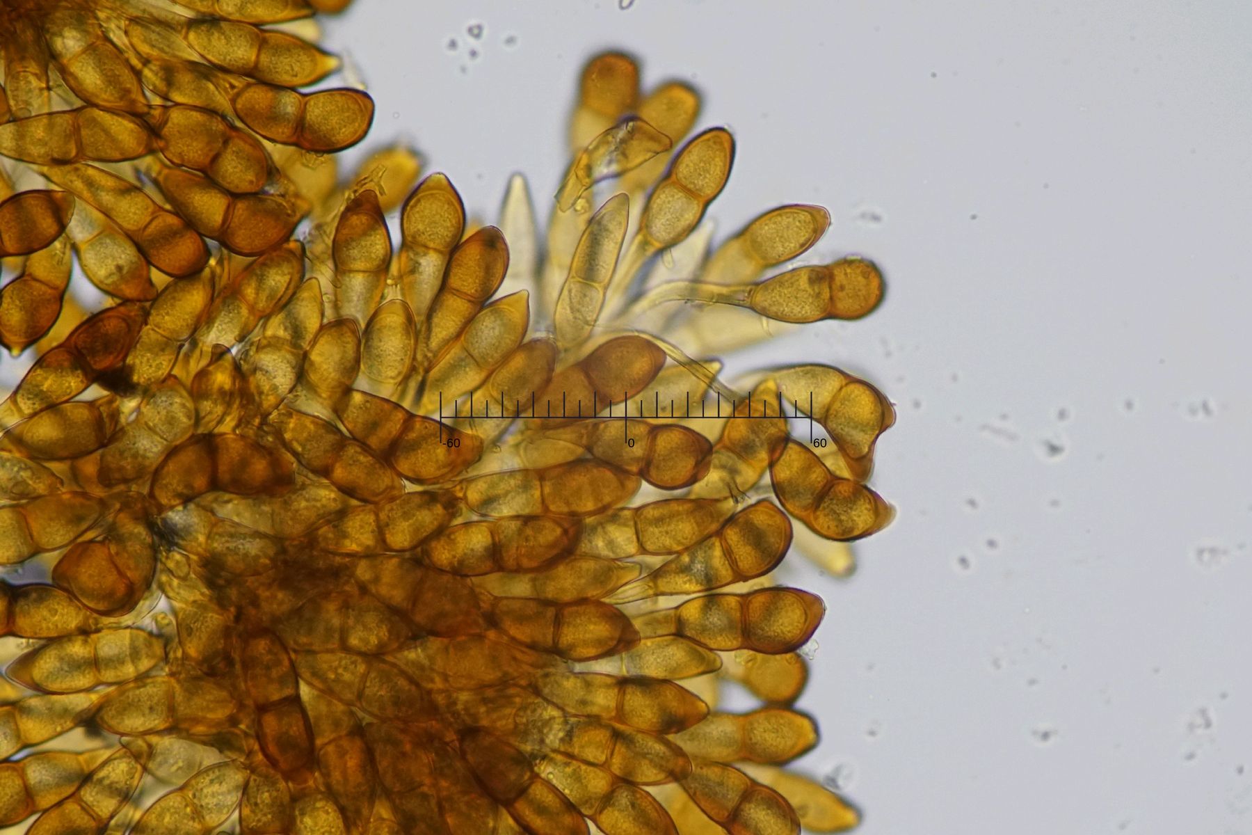 Ich messe bei meinem Exemplar eine Größe von 55.6-66.8 x 15.5-19.3 um (Q = 3.0-4.0). Das ist größer als die von Gäumann angegebenen Werte, aber laut Reinhard Berndt https://www.zobodat.at/pdf/Carolinea_57_0057-0064.pdf können die Teleutosporen von P. alnetorum sogar Längen von 70 um erreichen.