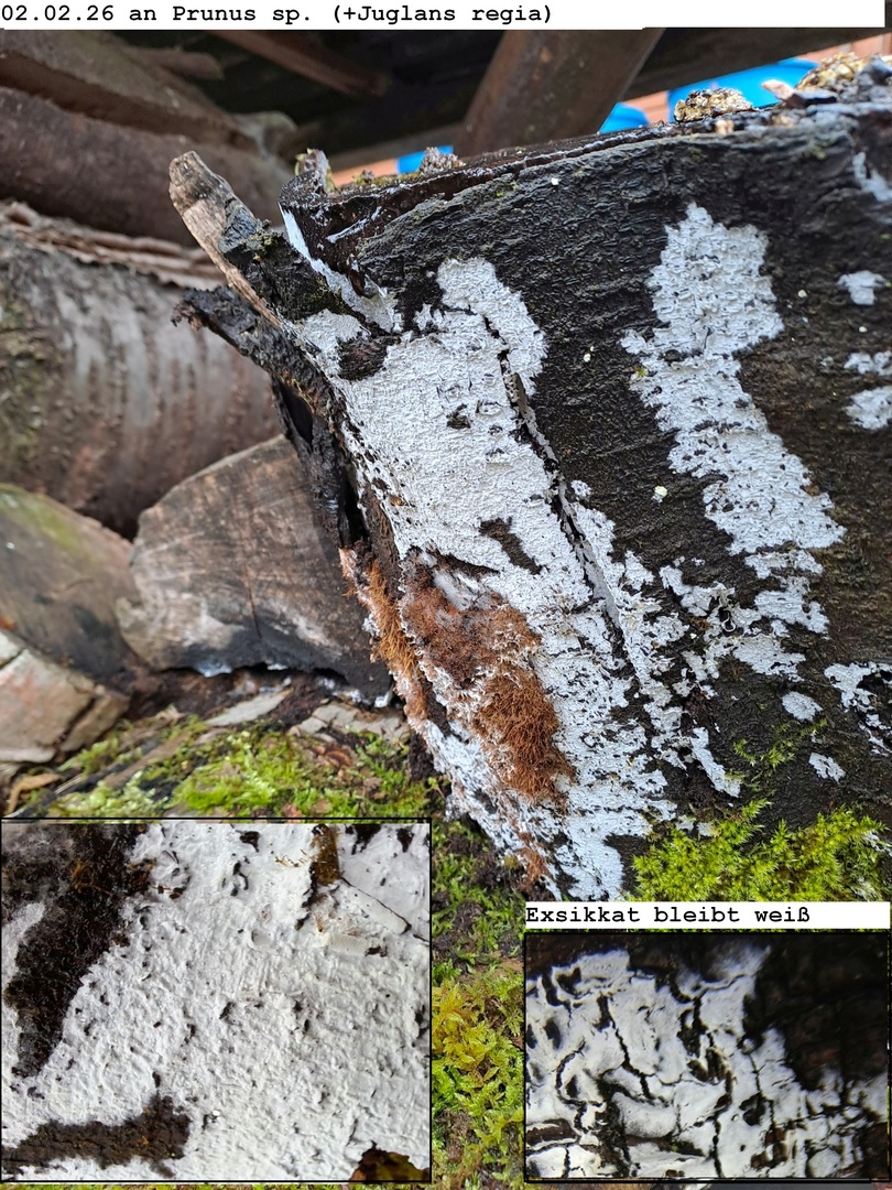 Die Sistotrema breitete sich auf der Rinde eines alten, feuchten Holzklotzes Prunus sp. aus und überzog noch ein darunterliegendes Walnussholz. Den Pilz beobachtete ich im eigenen Garten und er war zumindest im kompletten Februar vital.