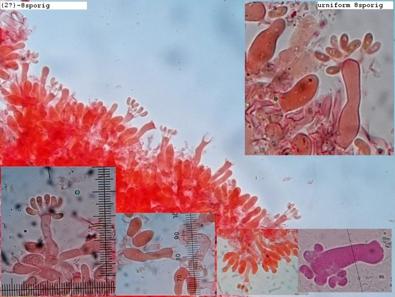 bei dieser mehrsporigen Sistotrema konnte ich Basidien mit 4,6 und 8 Sporen eindeutig (2sp. +/-) sehen. Eine 8sporige Basidie konnte ich auch mit etwas Glück abbilden (>Foto).
