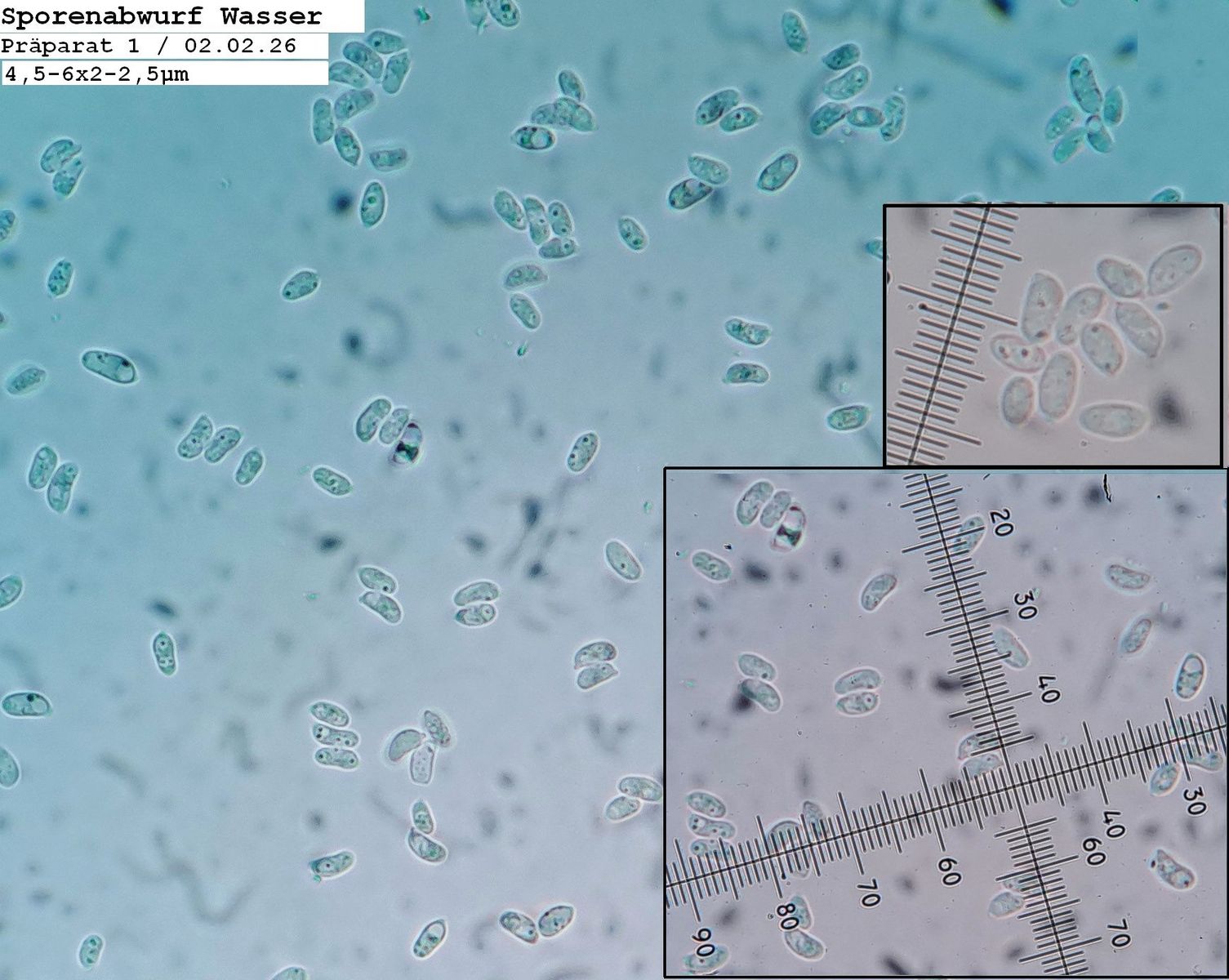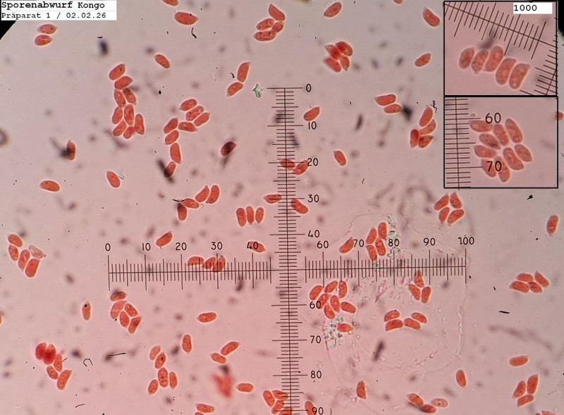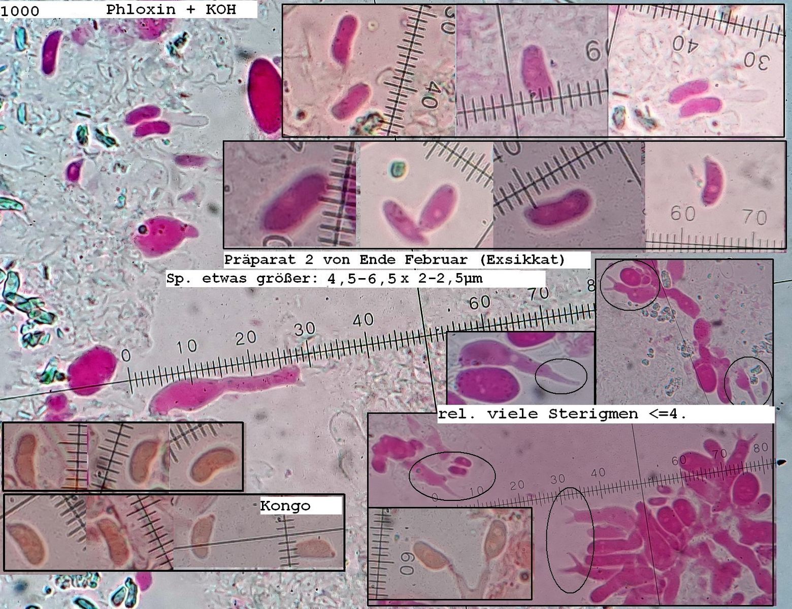 Neuer Frkp. 3 Wochen später: Sporen im Durchschnitt etwas größer und bis 6,5 (7) µm, sowie vermehrt 2sp. Basidien. Zumindest sah es oft aus nach Sterigmen kleiner gleich 4. >siehe Fotos Präparat 2 in Phloxin und Kongo.