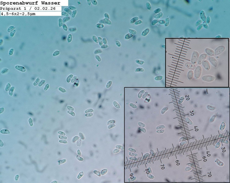 Die Sporengröße entspricht auch der Angabe von Elia Martini in aphyllo.net., wobei die Sporen in der Sporenskizze von Elia Martini im Durchschnitt länglicher sind als die Sp. von meinem Abwurf.