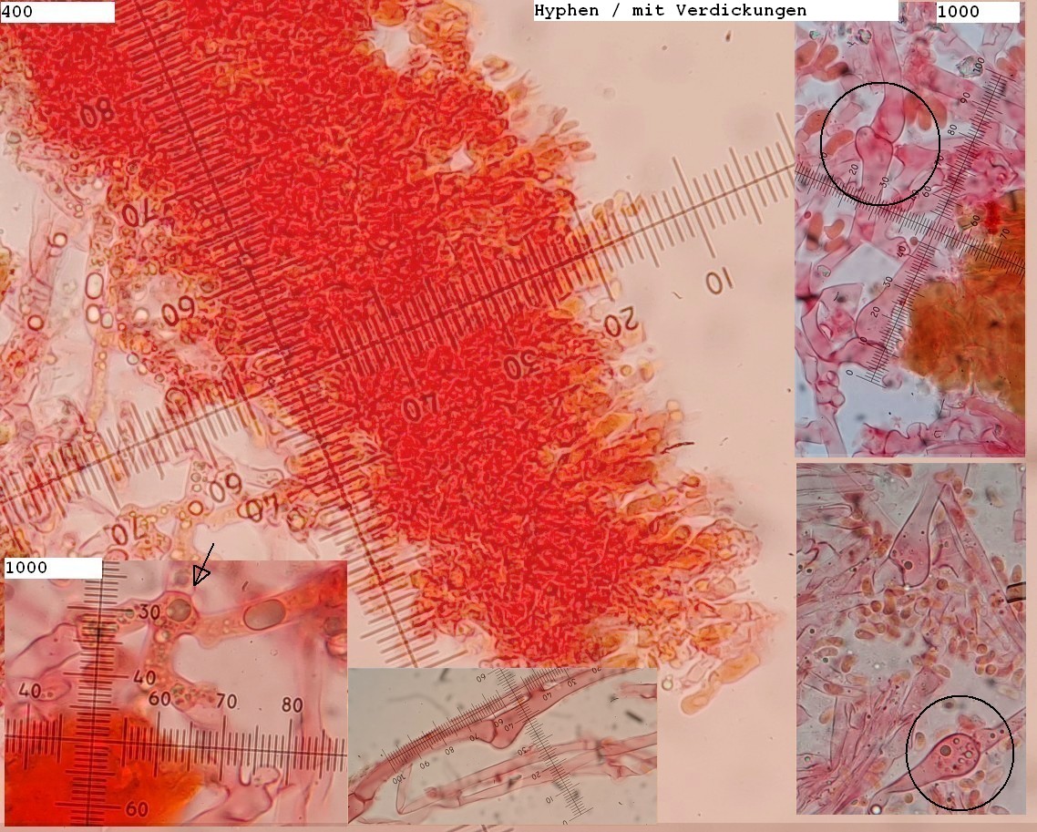 Die Hyphen bis 6 µm sind +/-dünnwandig, mit Schnallen, oft mit Öltropfen und auch mit deutlichen Verdickungen im Bereich der Schnallen.