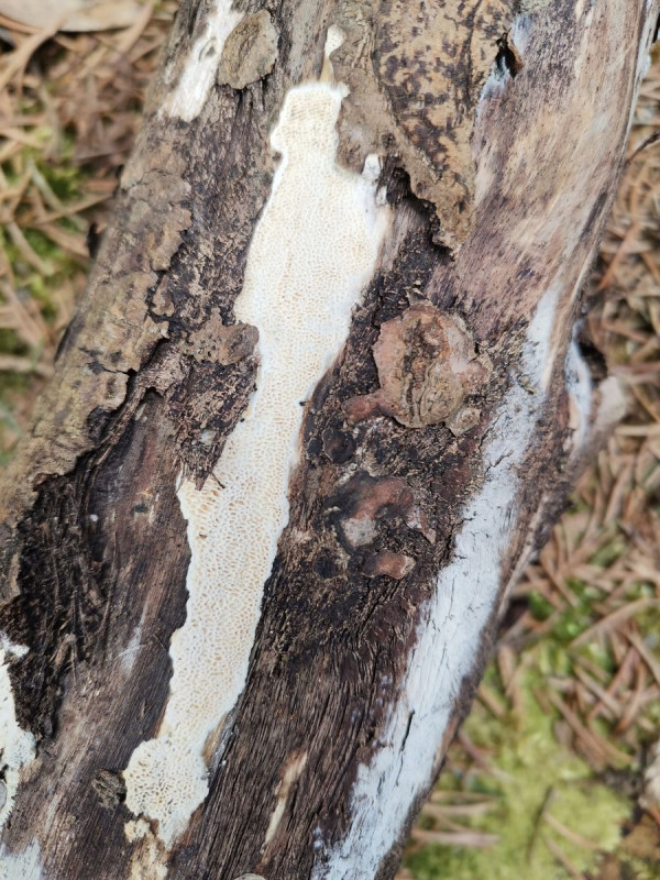 Makroskopisch erinnert mich Dein Fund an Cartilosoma ramentacea. Dann sollte das aber ein Kiefernast sein.