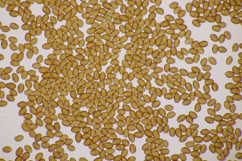 ich möchte noch einmal kurz auf das allererste Bild der Sporen zurückkommen. Da erkennt man zwar alles, was man erkennen muß, ich möchte aber trotzdem dafür werben, daß man Sporen anhand eines Sporenabwurfs untersucht. Da ist man dann wirklich sicher, daß alle Sporen auch richtig reif sind. Und wenn man geschickt ist, schafft man es sogar, eine einzige Monolage an Sporen zu präpararieren, wodurch man ein sehr flaches Präparat hat und dadurch das gesamte Blickfeld in der Fokusebene.
