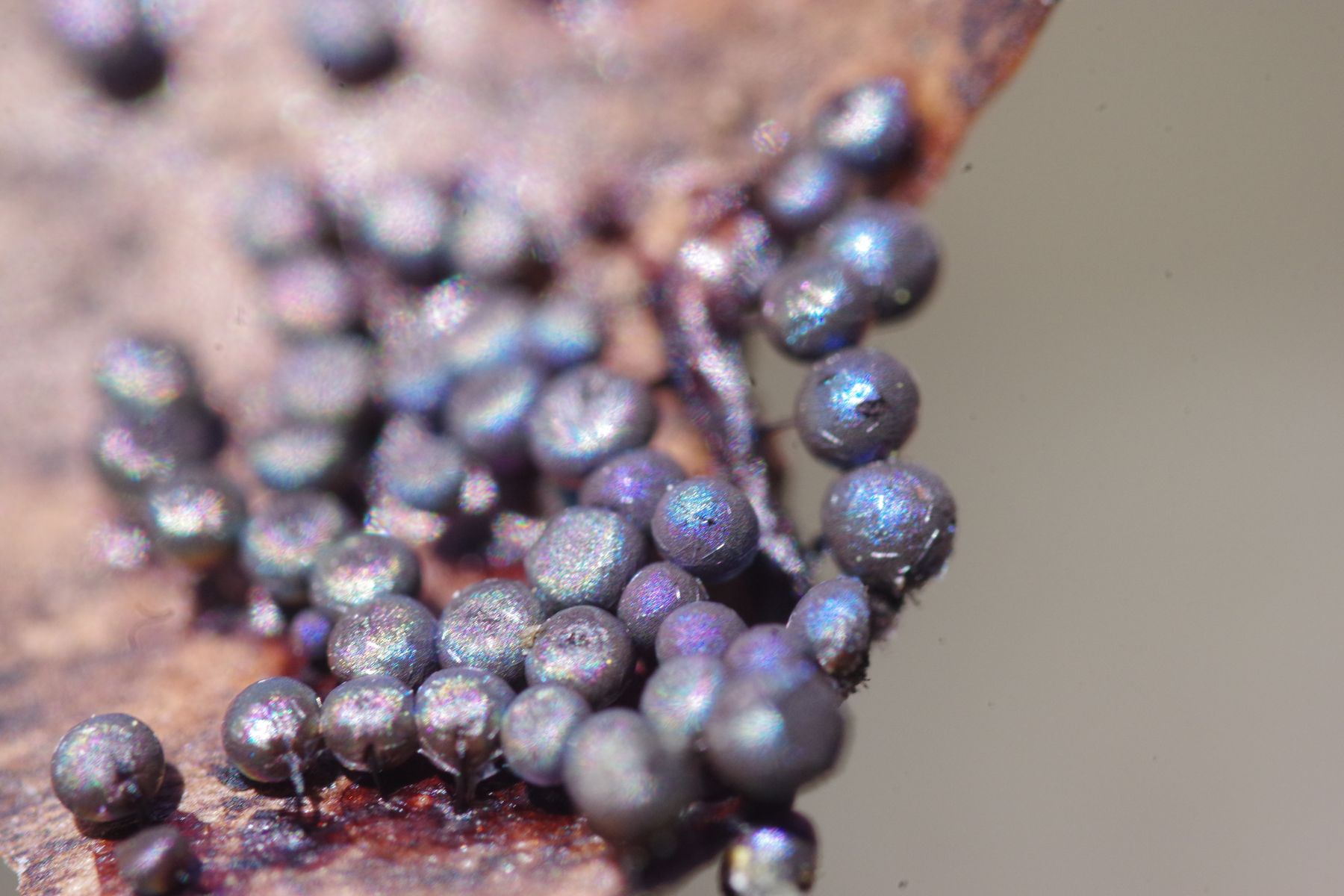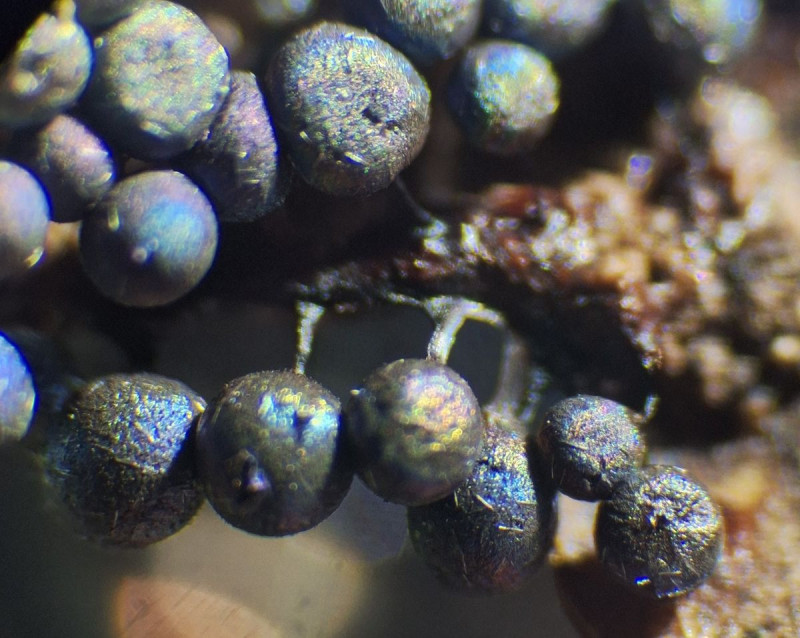 von einem Wurzelteller, auf ziemlich dünner Rinde der Wurzel stammt dieser auffallen metallisch blau-grün glänzende Schleimpilz.